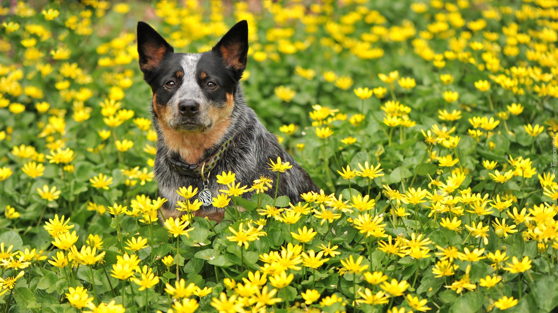 Edytor tapety: Australijski pies pasterski na kwiatowej łące