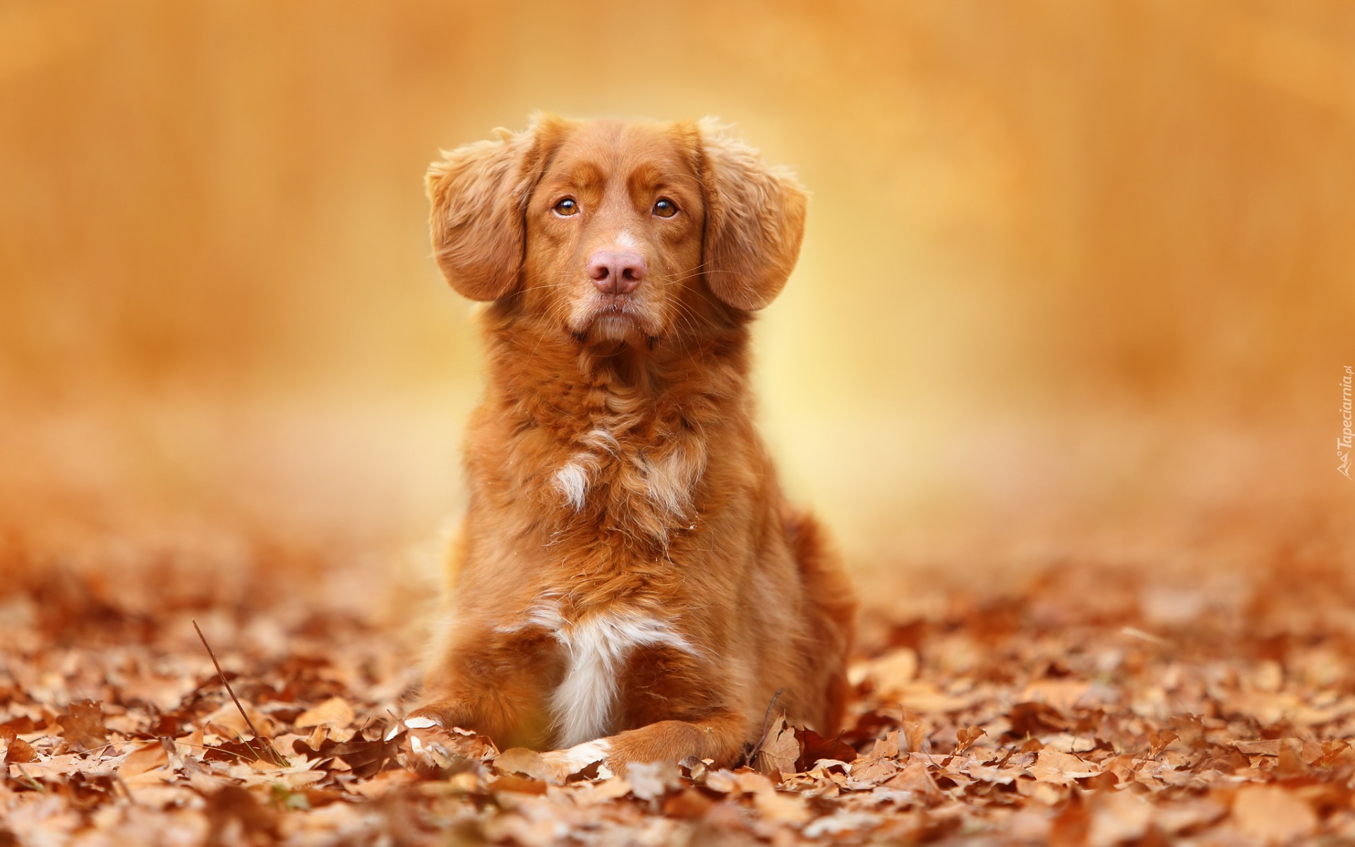 Edytor tapety: Retriever z Nowej Szkocji usiadł na jesiennych liściach