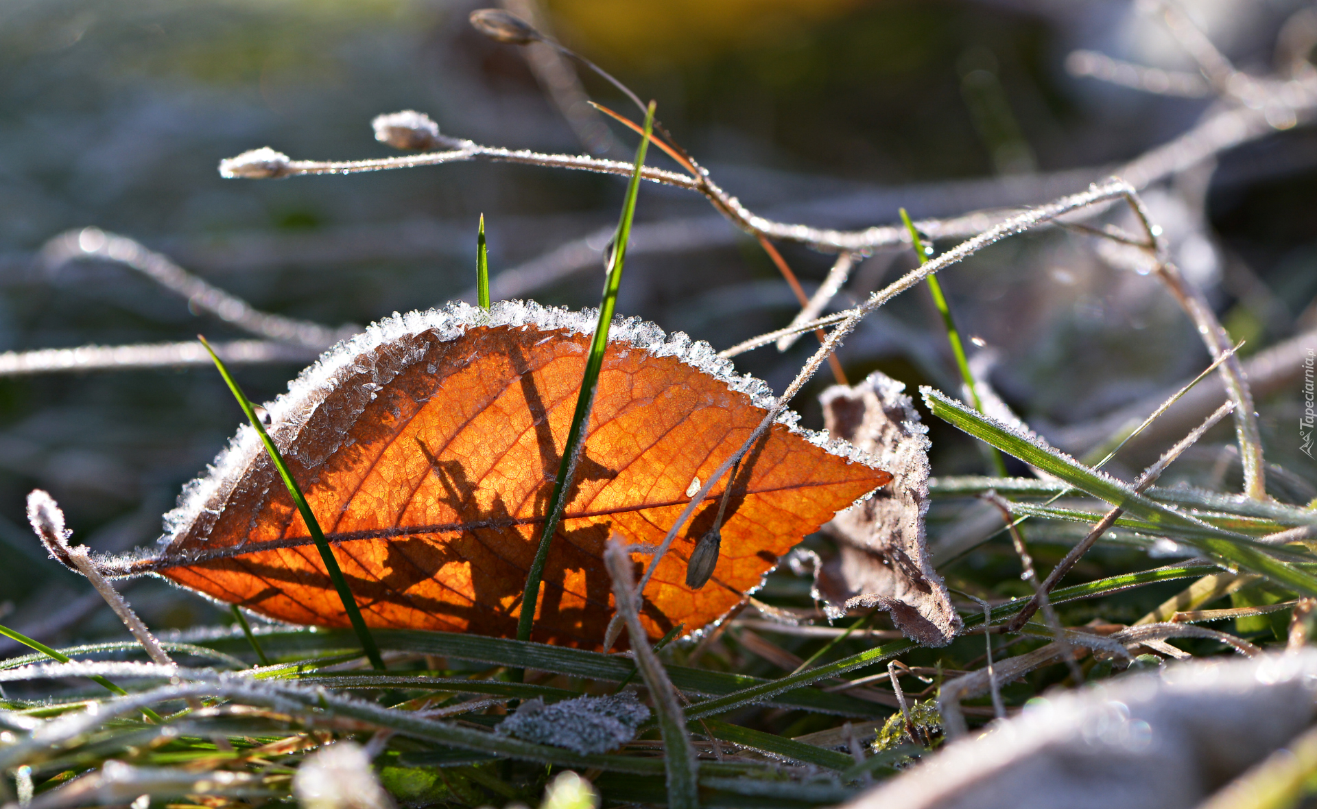 Edytor tapety: Jesienny liść zaplątany w trawach