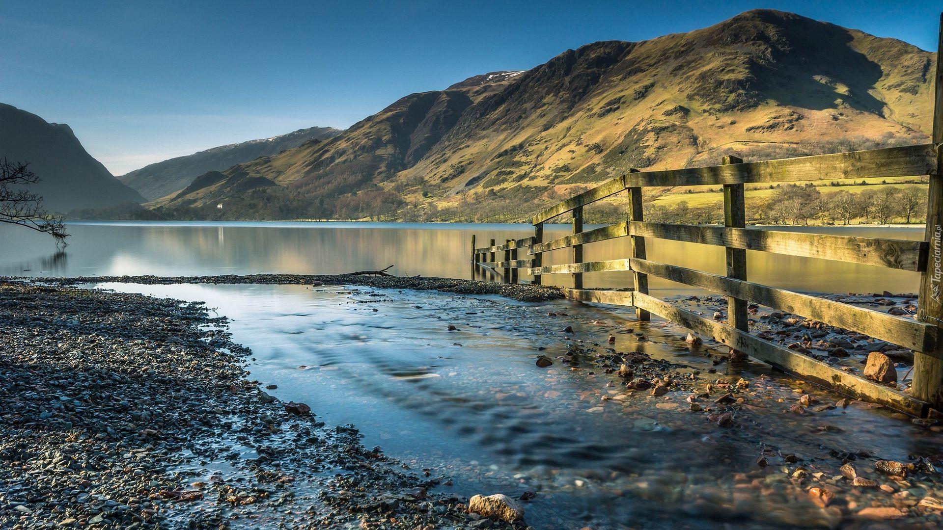 Edytor tapety: Ogrodzenie przy brzegu kamienistego jeziora w górach
