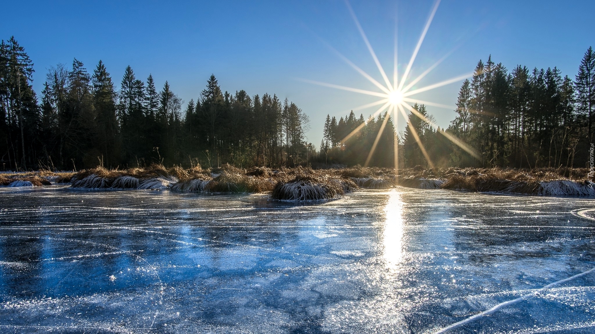 Edytor tapety: Promienie słońca padają na oblodzone jezioro i drzewa
