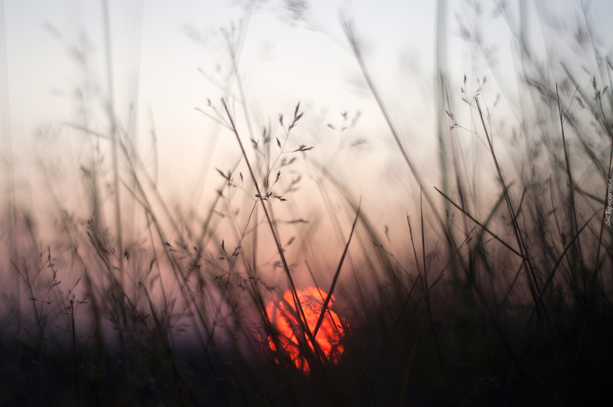 Edytor tapety: Zachodzące słońce za źdźbłami trawy