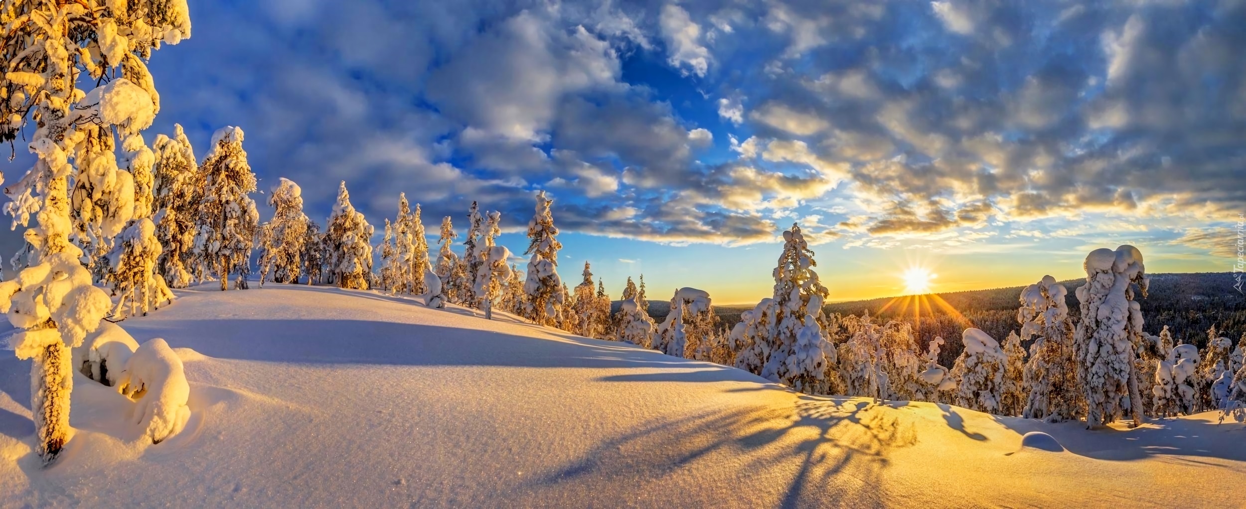 Edytor tapety: Wschodzące słońce rzuca swe promienie na ośnieżone drzewa