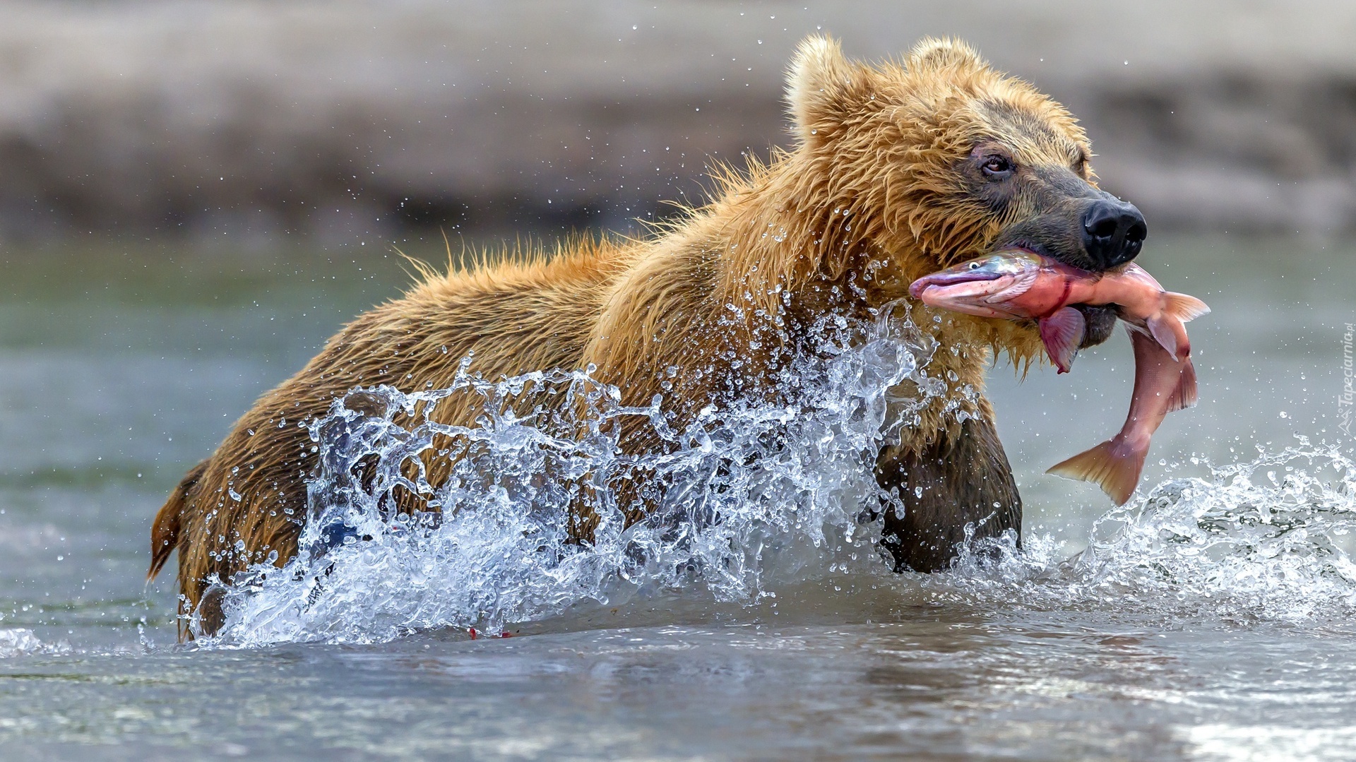 Edytor tapety: Niedźwiedź z rybą upolowaną w rzece