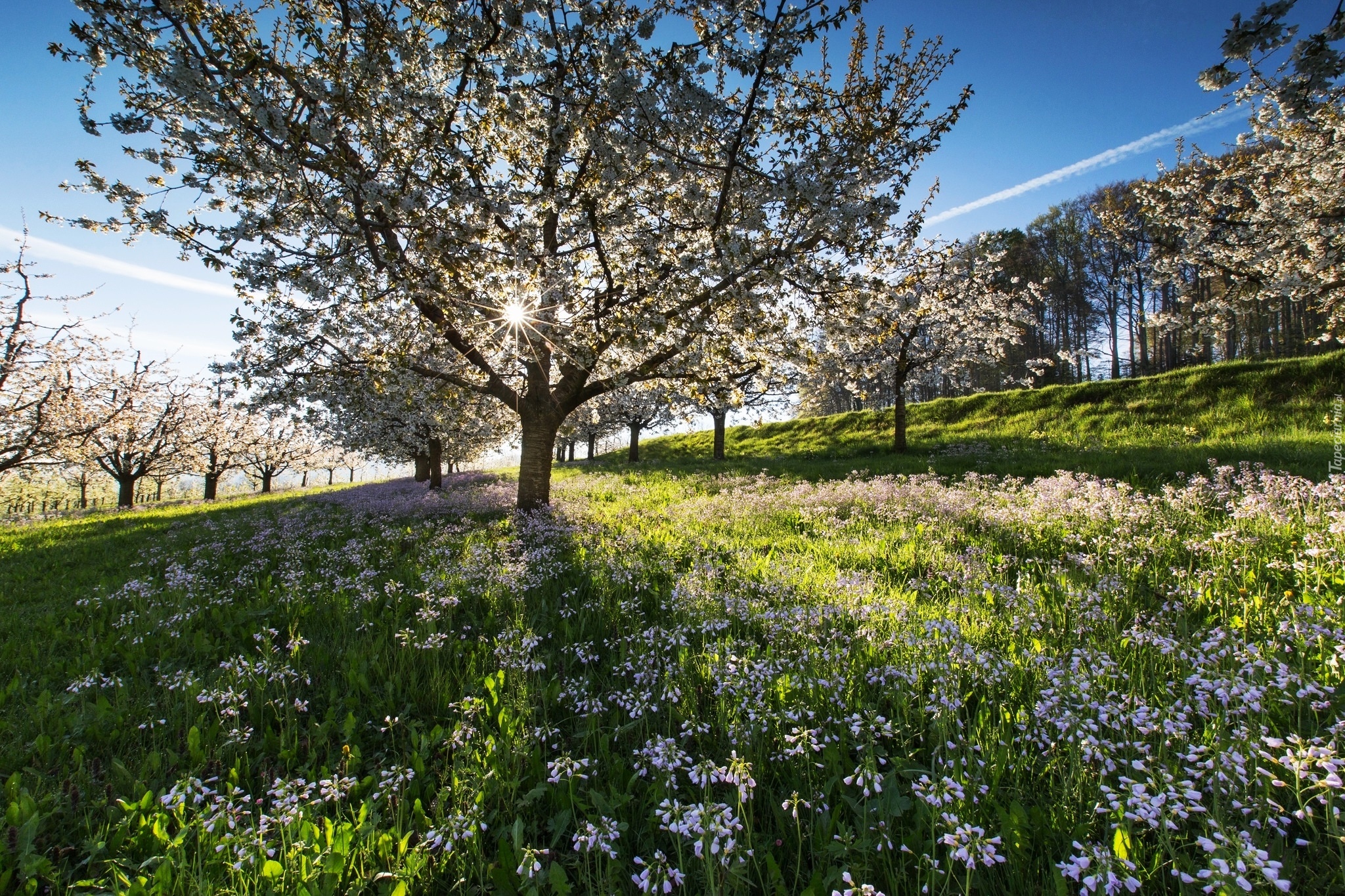 Edytor tapety: Wiosenne promienie słońca wpadają do kwitnącego sadu