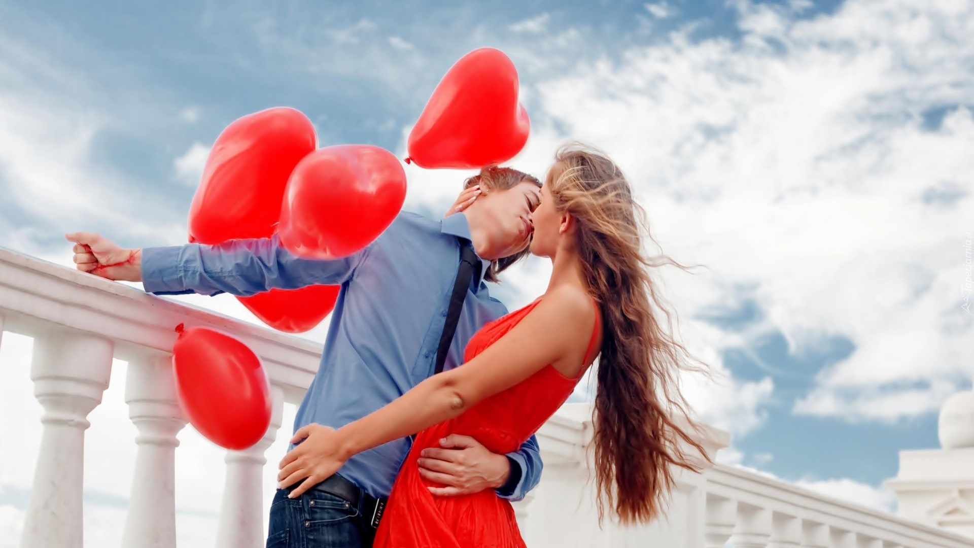 Edytor tapety: Zakochani z balonami na moście w walentynkowym pocałunku