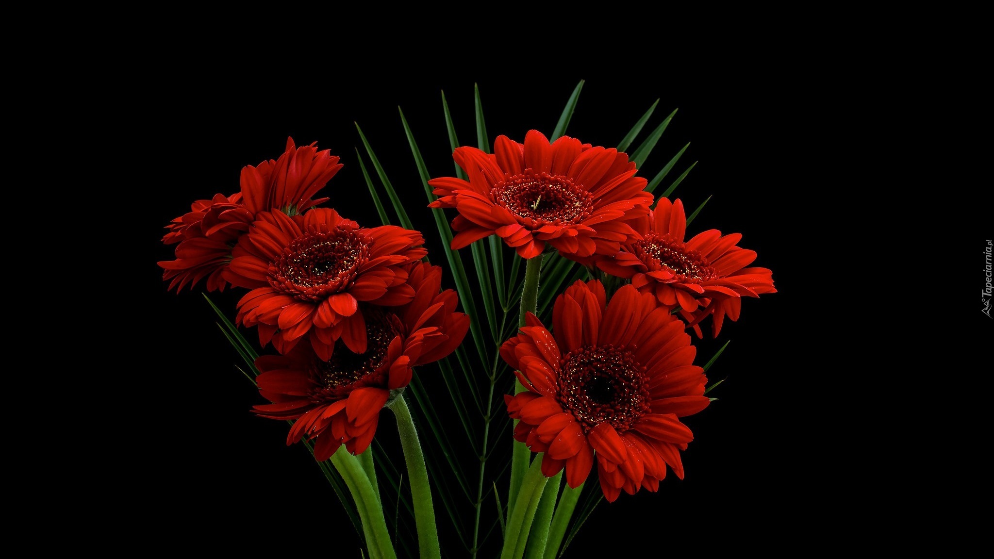 Edytor tapety: Bukiet czerwonych gerber na czarnym tle