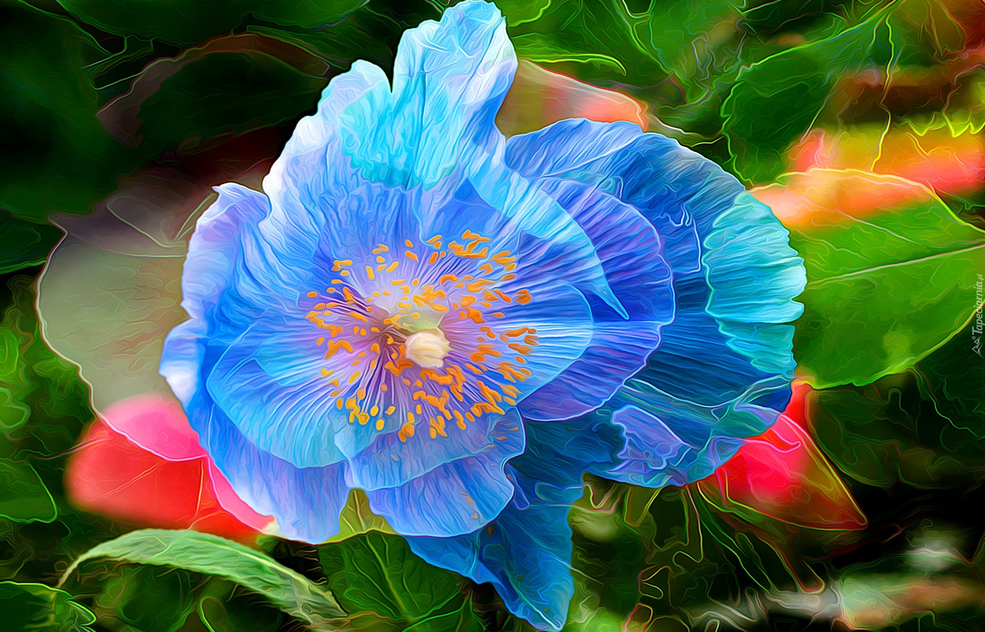 Edytor tapety: Niebieskie kwiaty z liśćmi w grafice fractalius