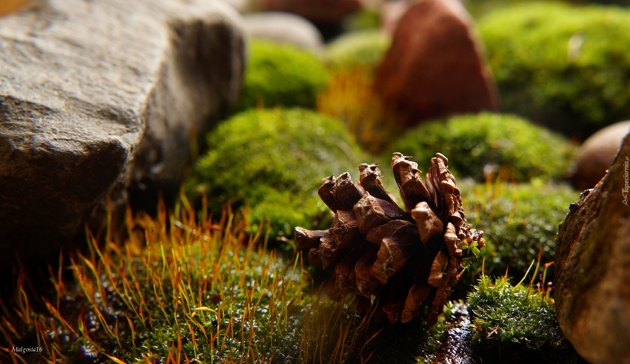 Edytor tapety: Szyszka pośród kamieni na mchu