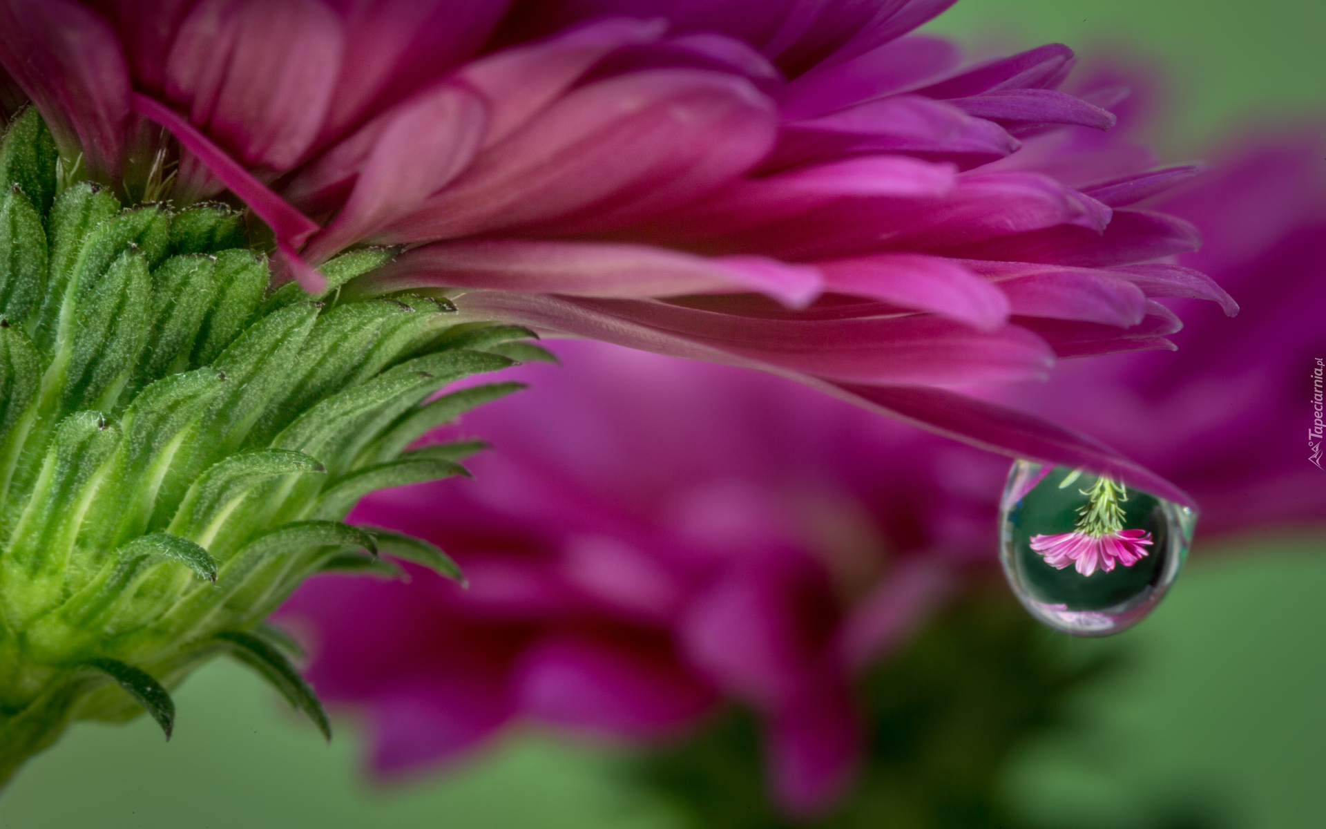Edytor tapety: Kropla wody na płatku różowego kwiatka z bliska