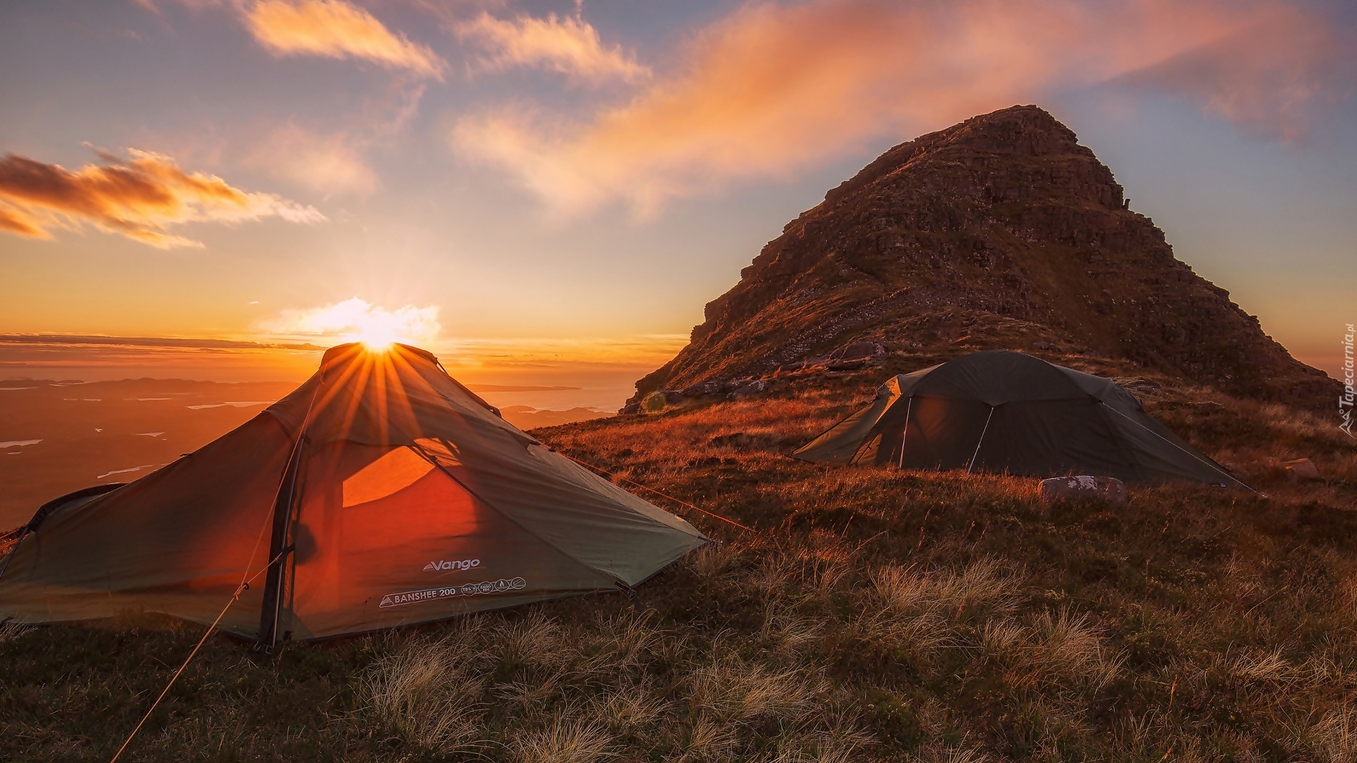 Edytor tapety: Rozłożone namioty w górach o zachodzie słońca