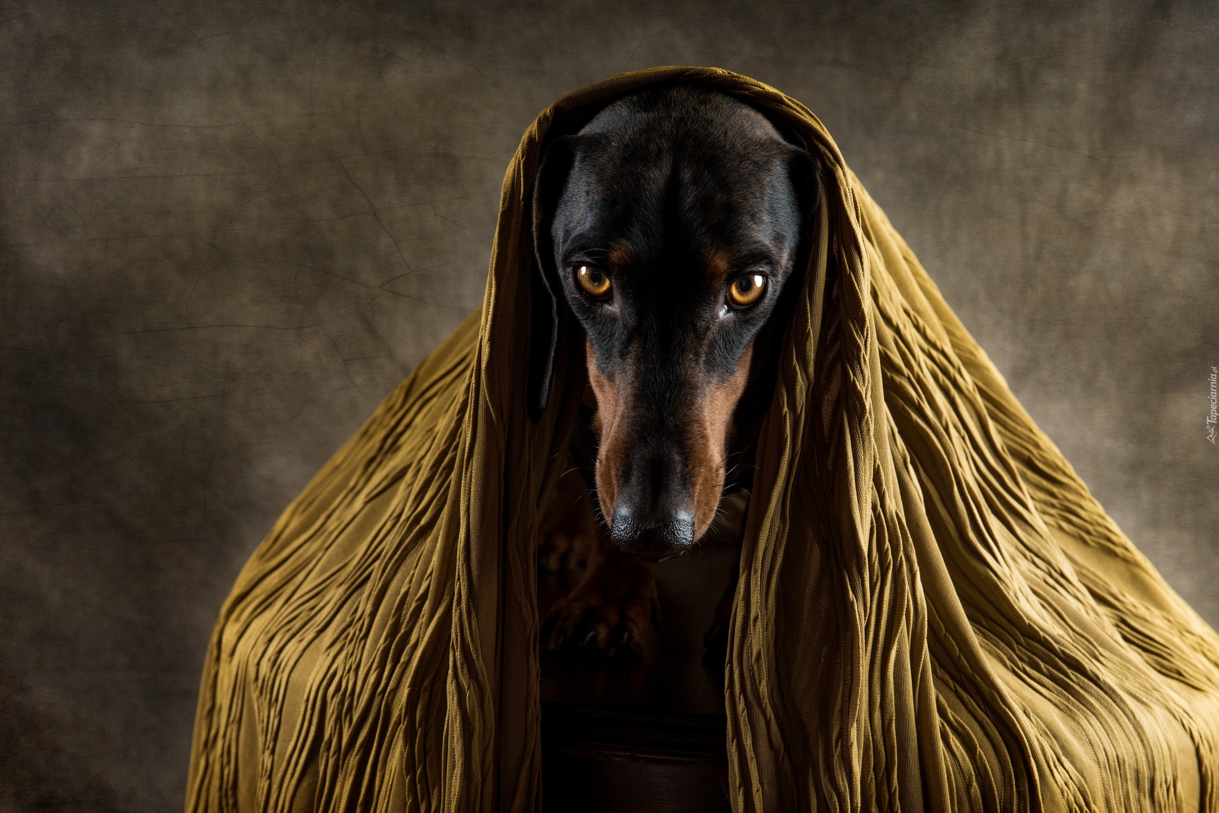 Edytor tapety: Smutny jamnik okryty szalem