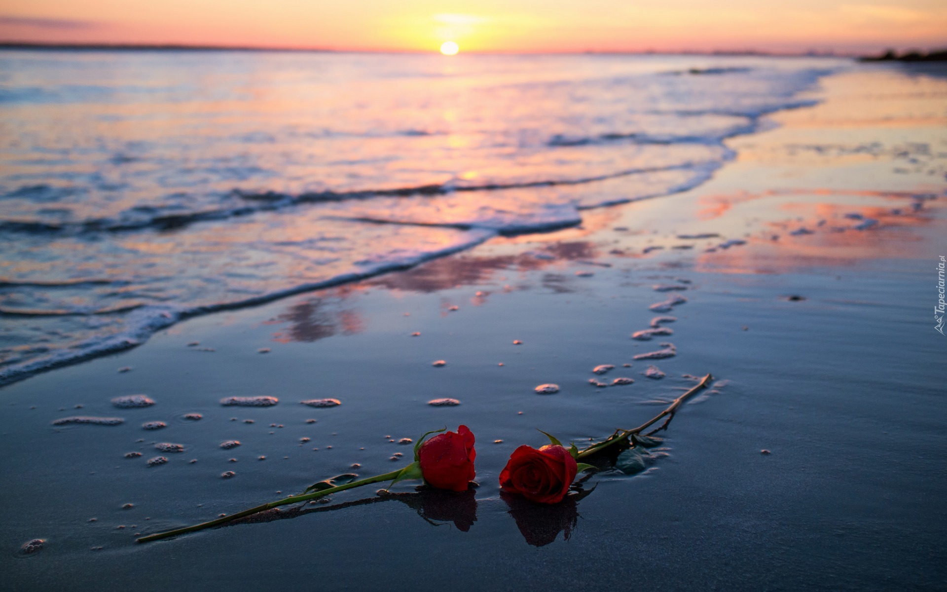 Edytor tapety: Czerwone róże na morskiej plaży o zachodzie słońca