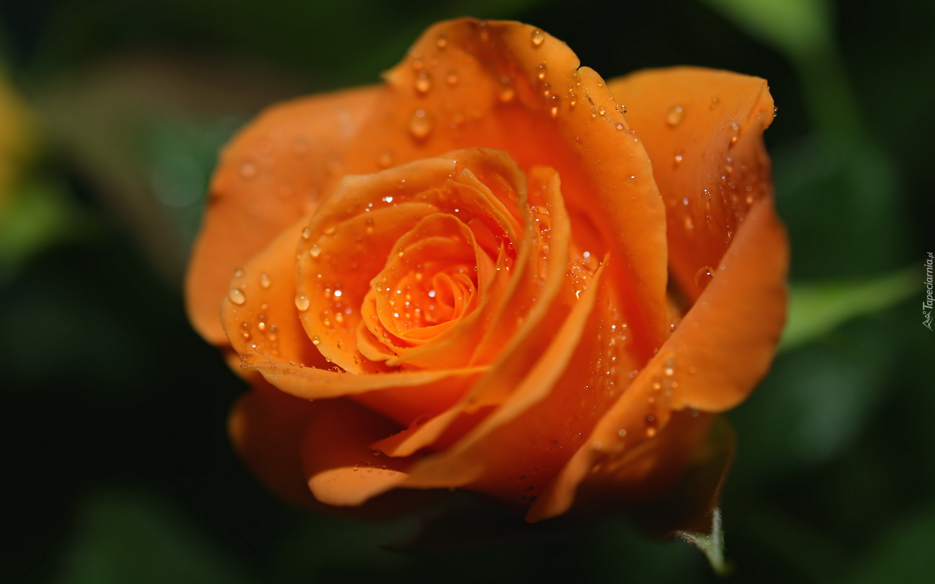 Edytor tapety: Pomarańczowa róża w kroplach deszczu na rozmytym tle