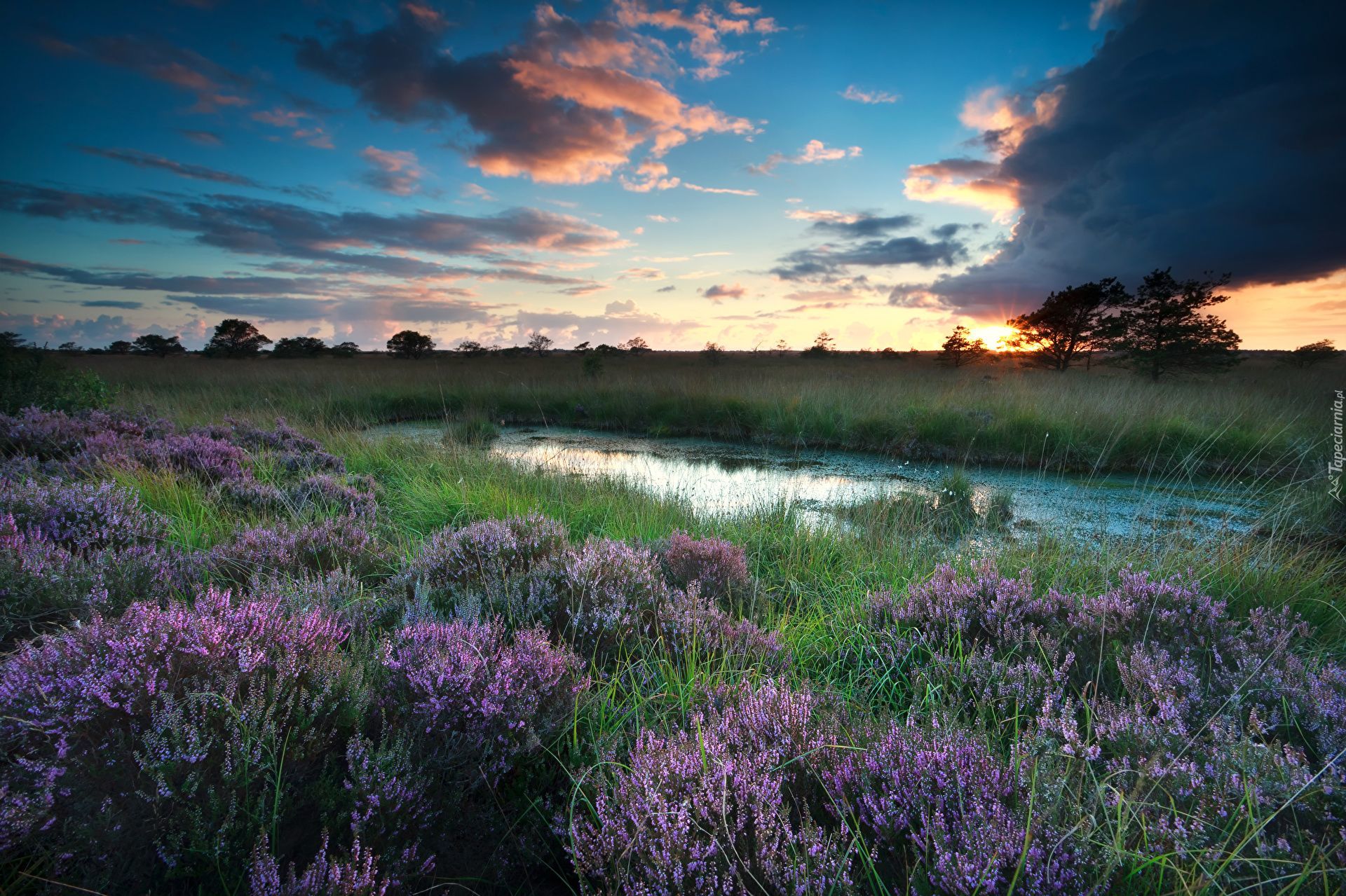 Edytor tapety: Bagno otoczone wrzosowiskiem i trawą o świcie