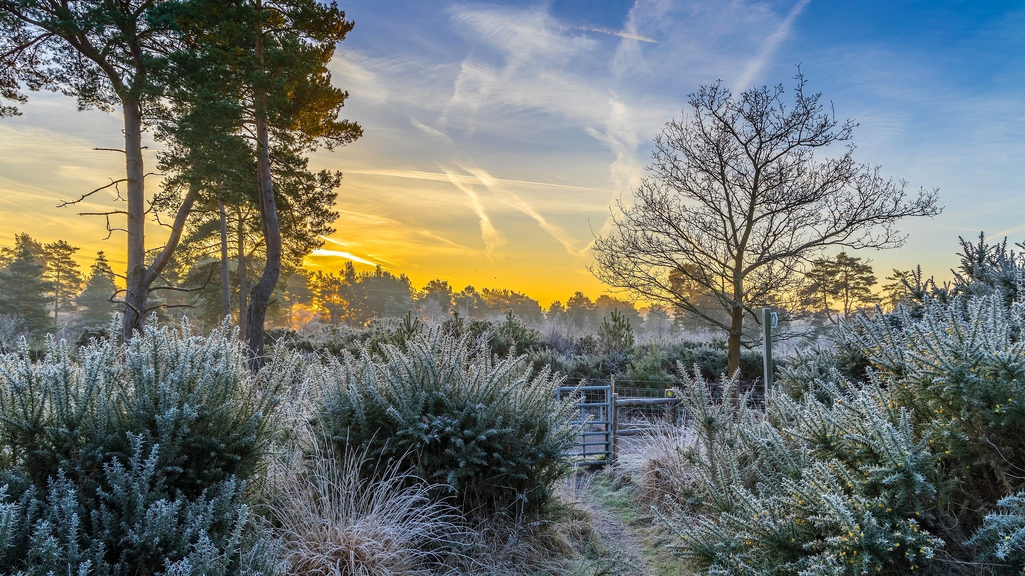 Edytor tapety: Oszronione drzewa i rośliny przy ogrodzeniu o świcie