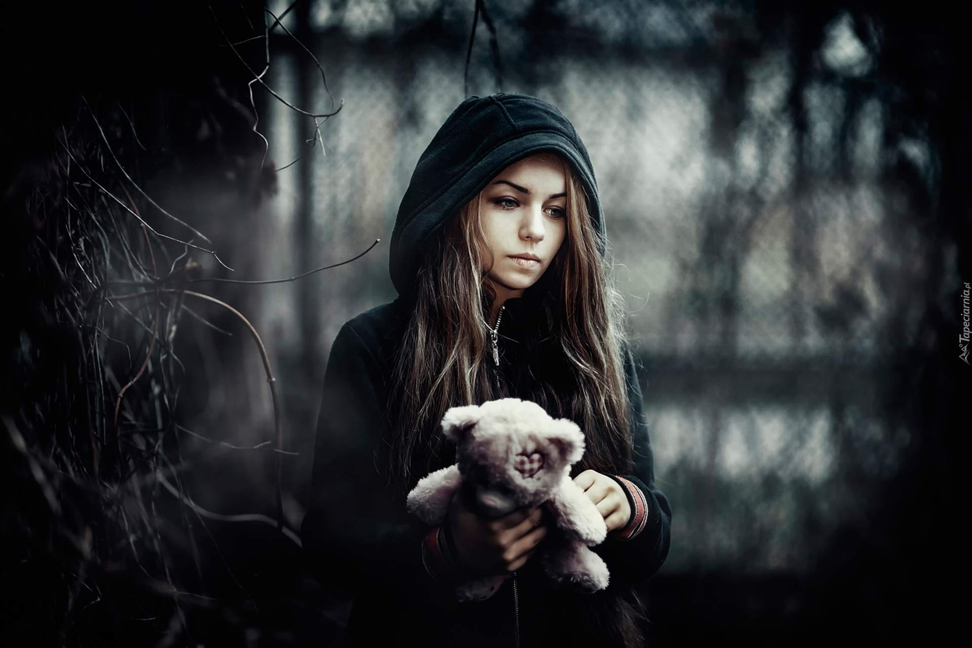 Edytor tapety: Smutna dziewczyna z pluszowym misiem