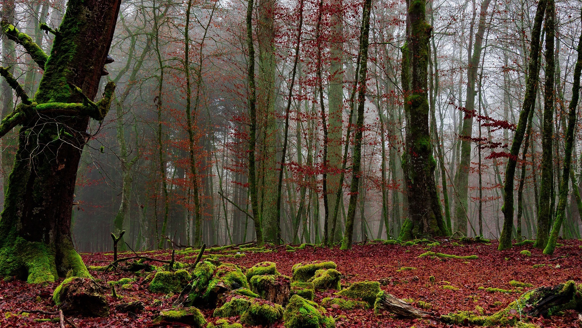 Edytor tapety: Jesienny omszały las pokryty liśćmi