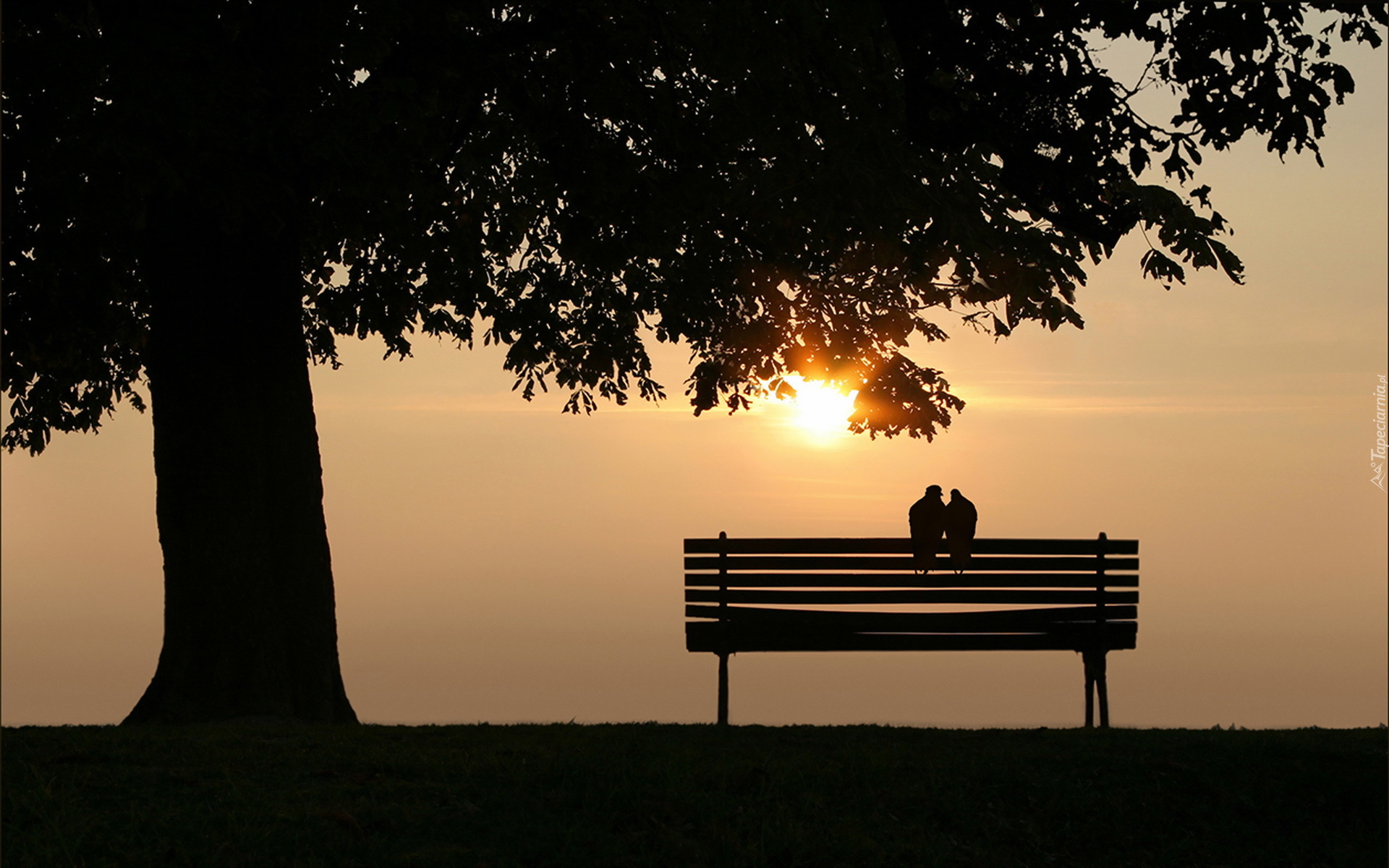 Edytor tapety: Gołąbki na ławce pod drzewem o zachodzie słońca