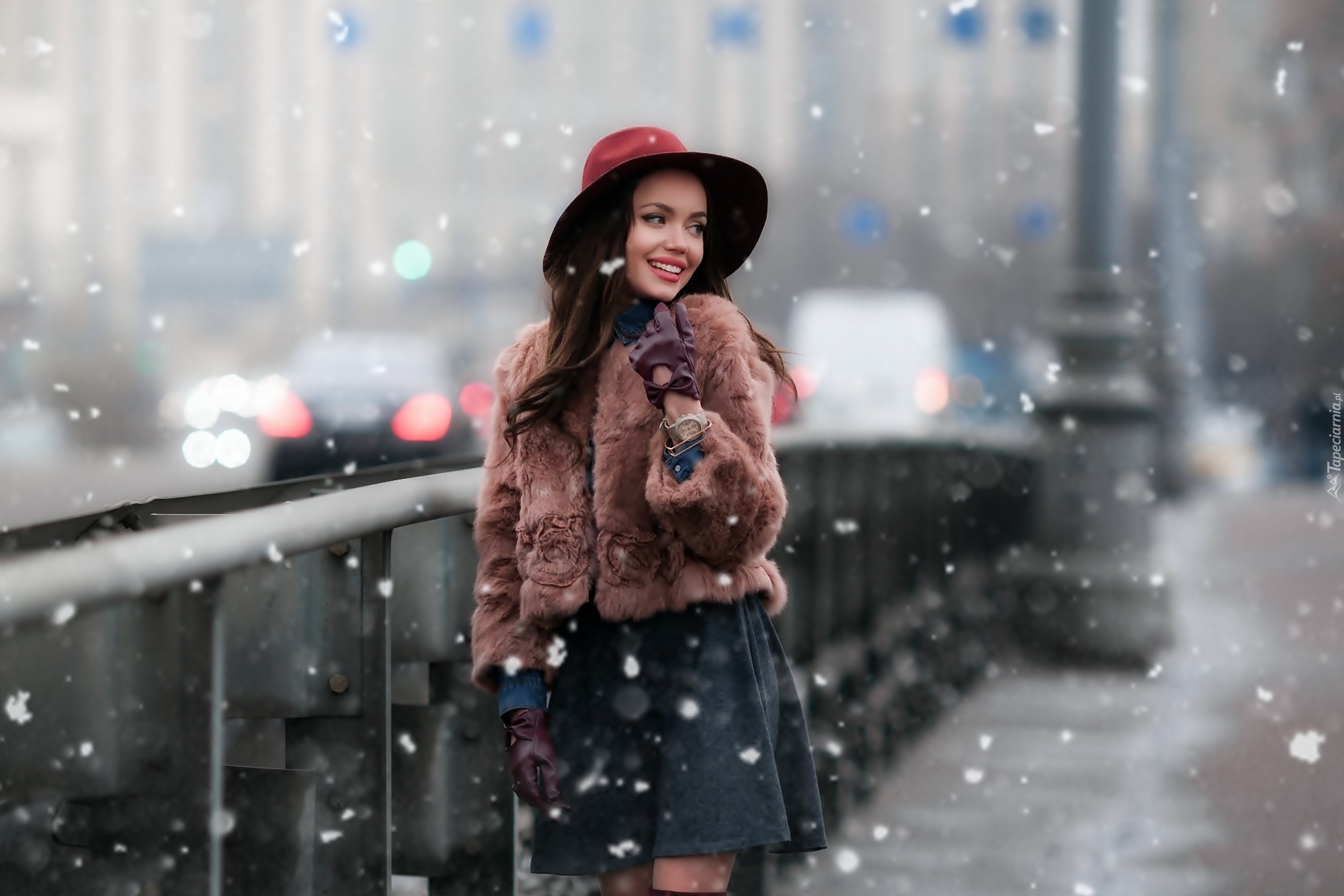 Edytor tapety: Modelka w kapeluszu obserwuje lecące płatki śniegu