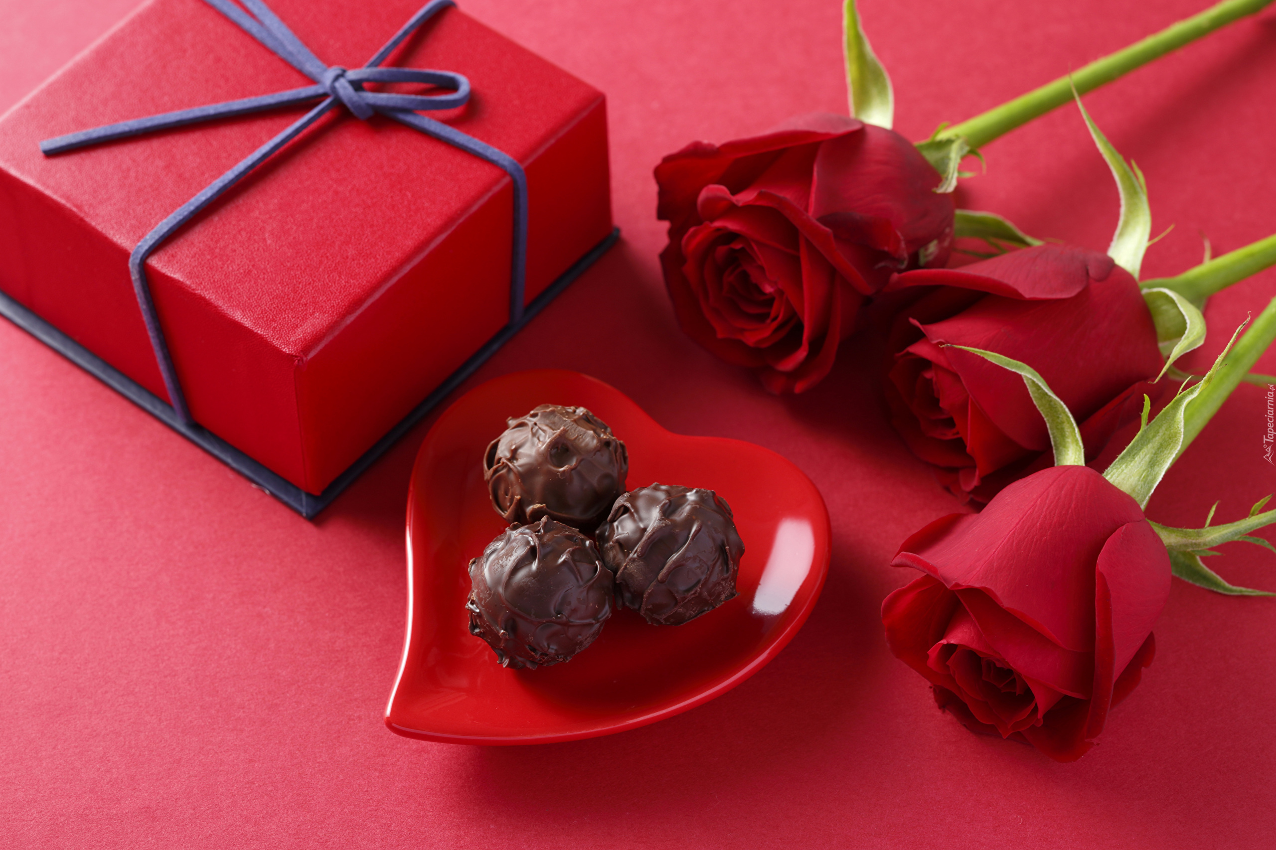 Edytor tapety: Walentynkowa kompozycja ze słodkościami, różami i prezentem
