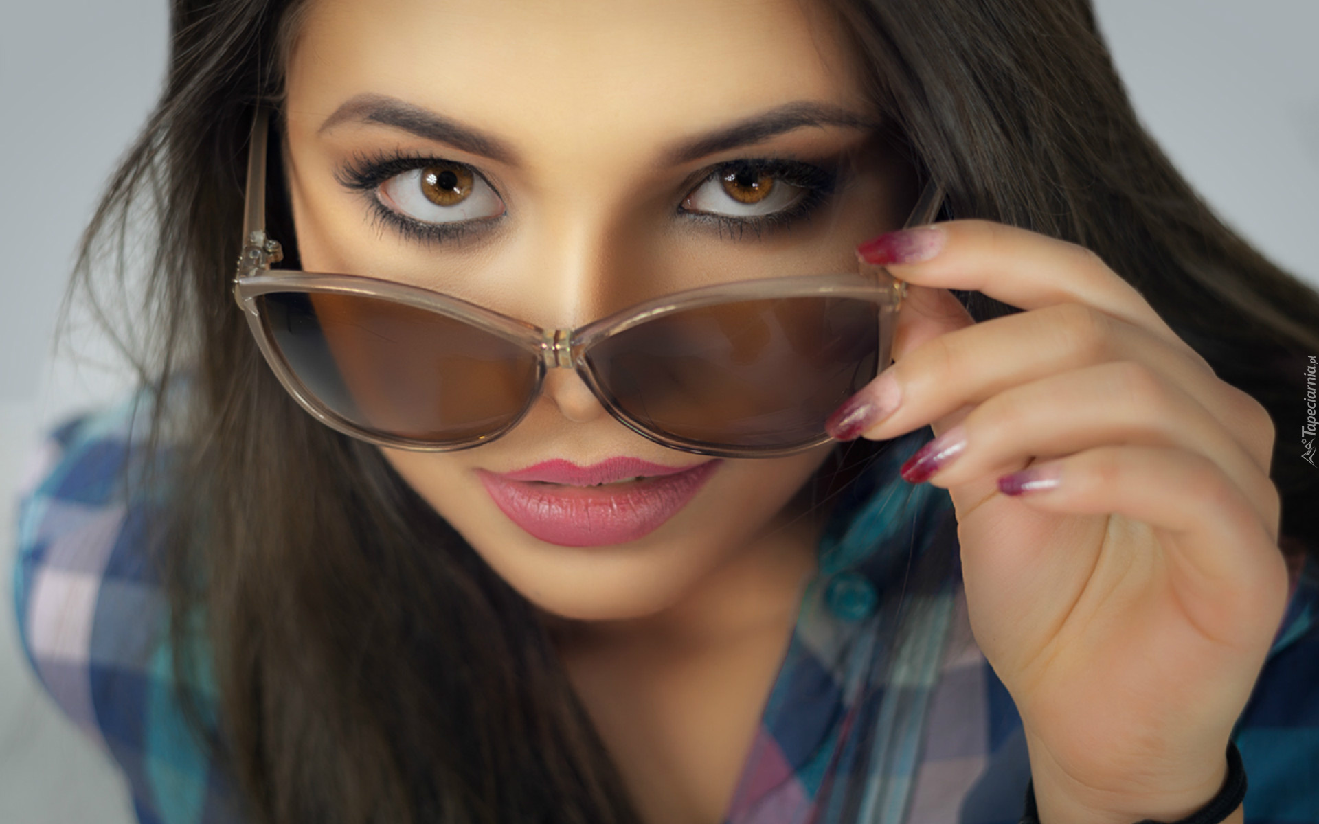 Edytor tapety: Piękna brunetka spogląda zza okularów przeciwsłonecznych