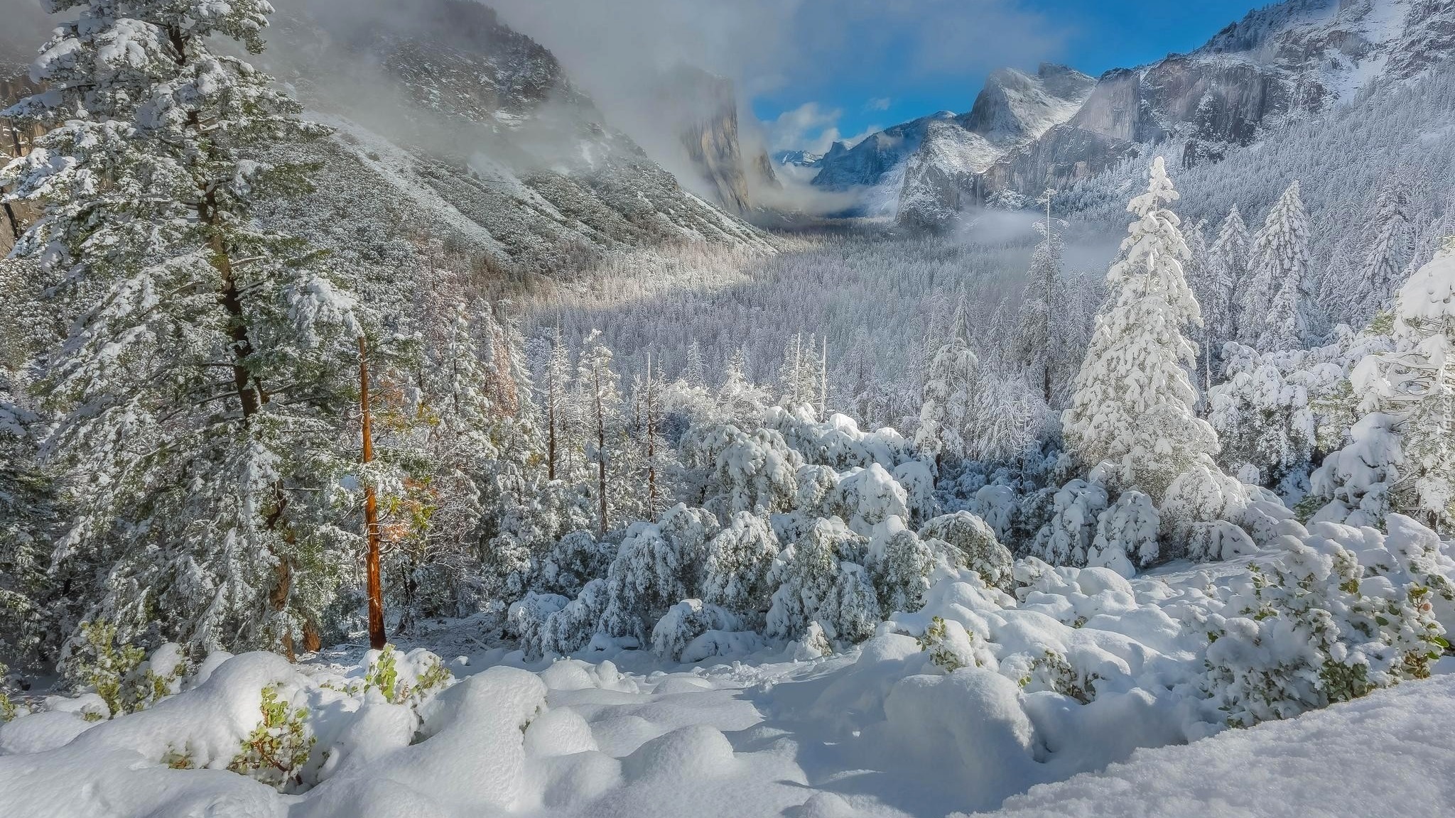 Edytor tapety: Góry i drzewa przykryte śniegiem