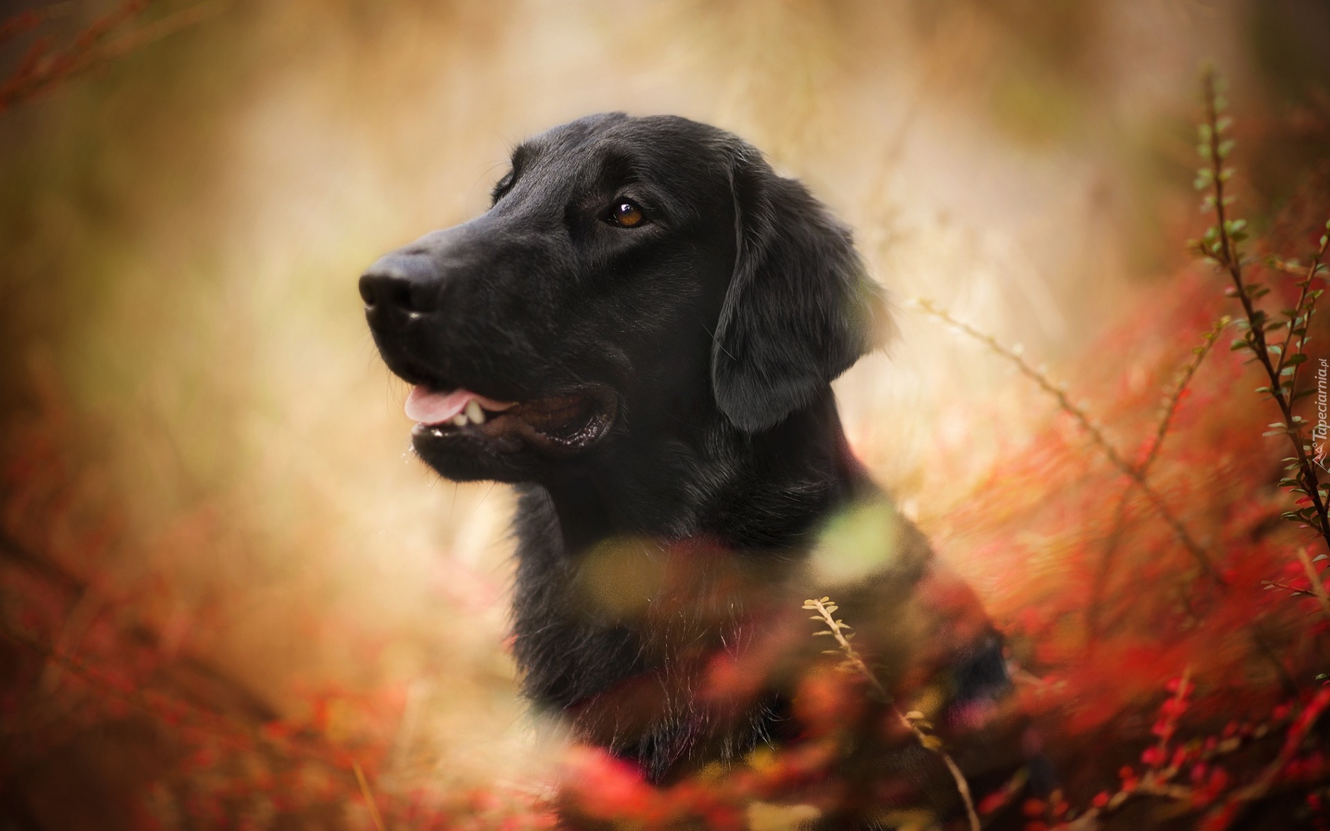 Edytor tapety: Flat coated retriever pośród rozmytych gałęzi