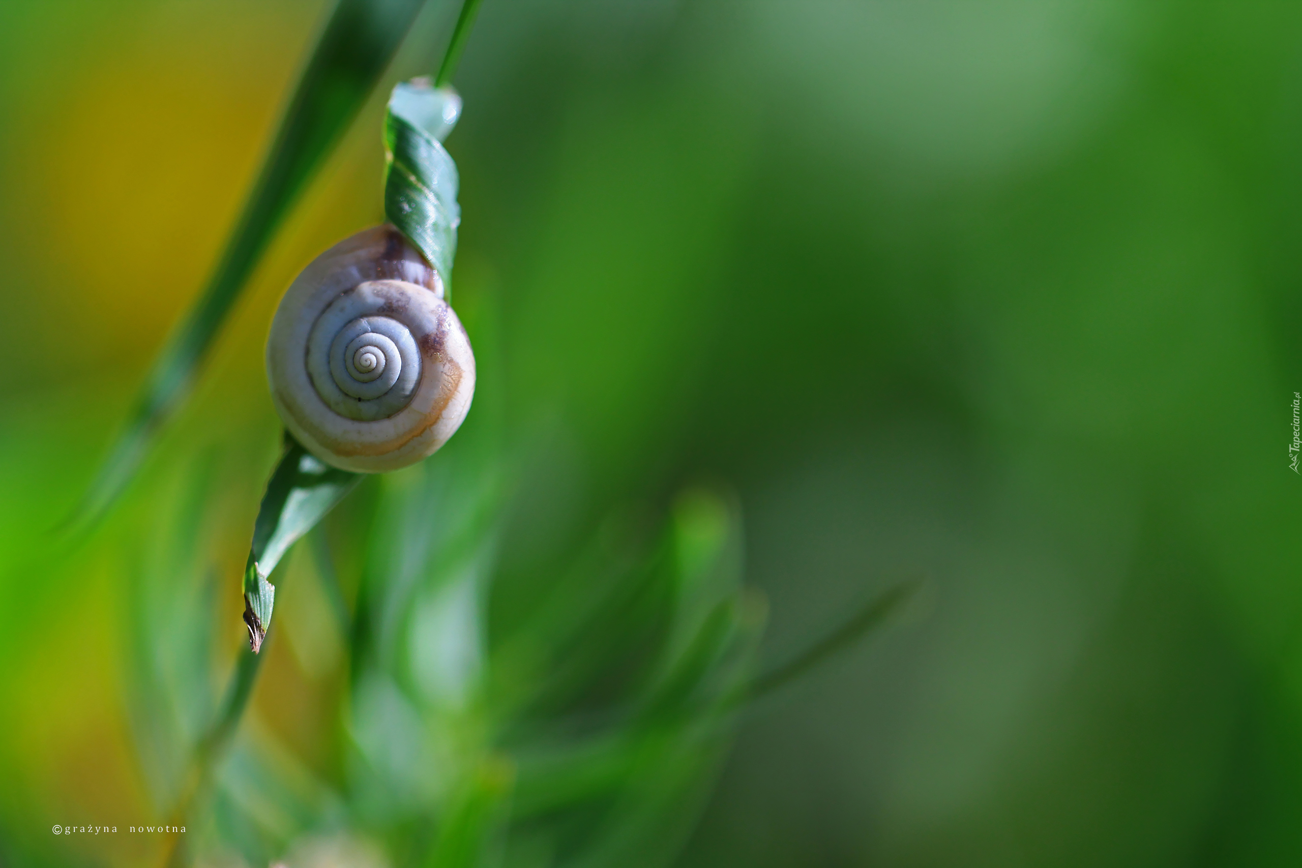 Edytor tapety: Ślimak z muszlą wspina się po trawie