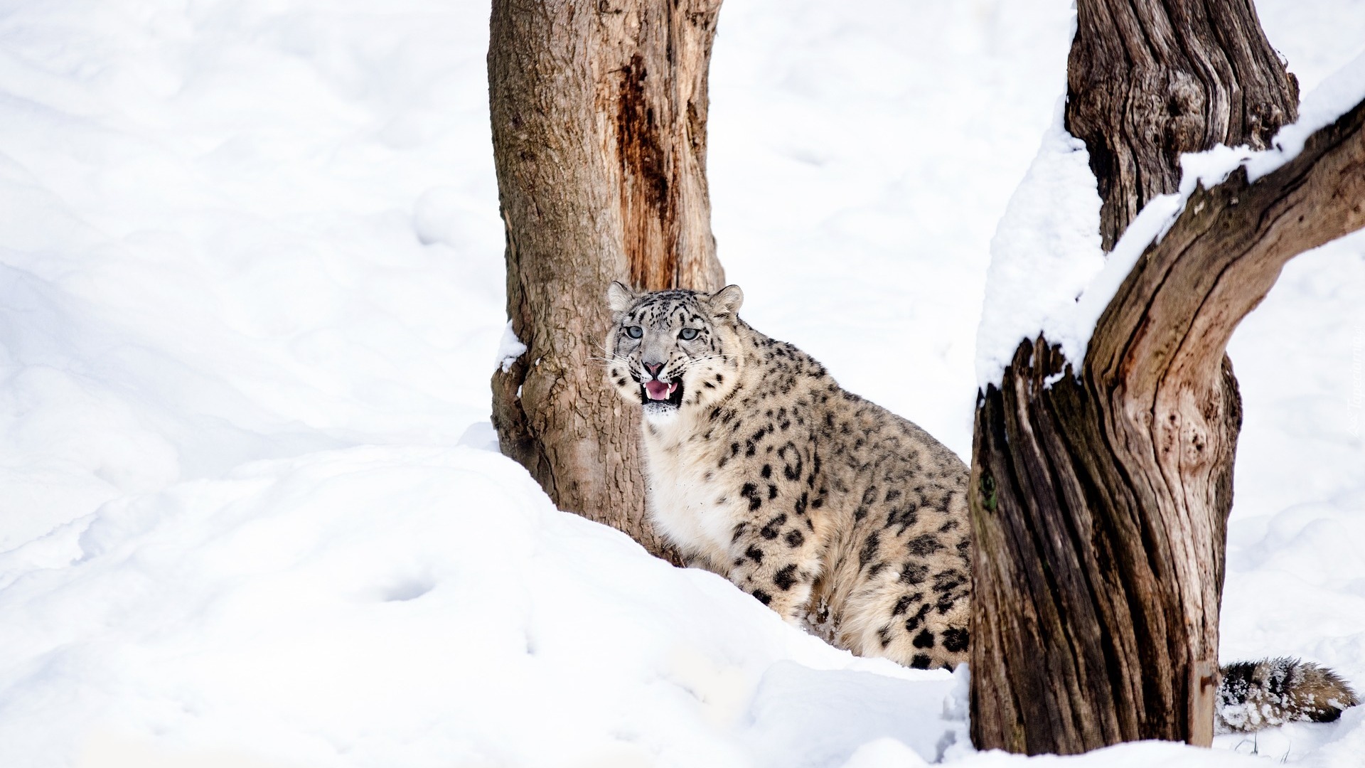 Edytor tapety: Irbis śnieżny obok uschniętego drzewa