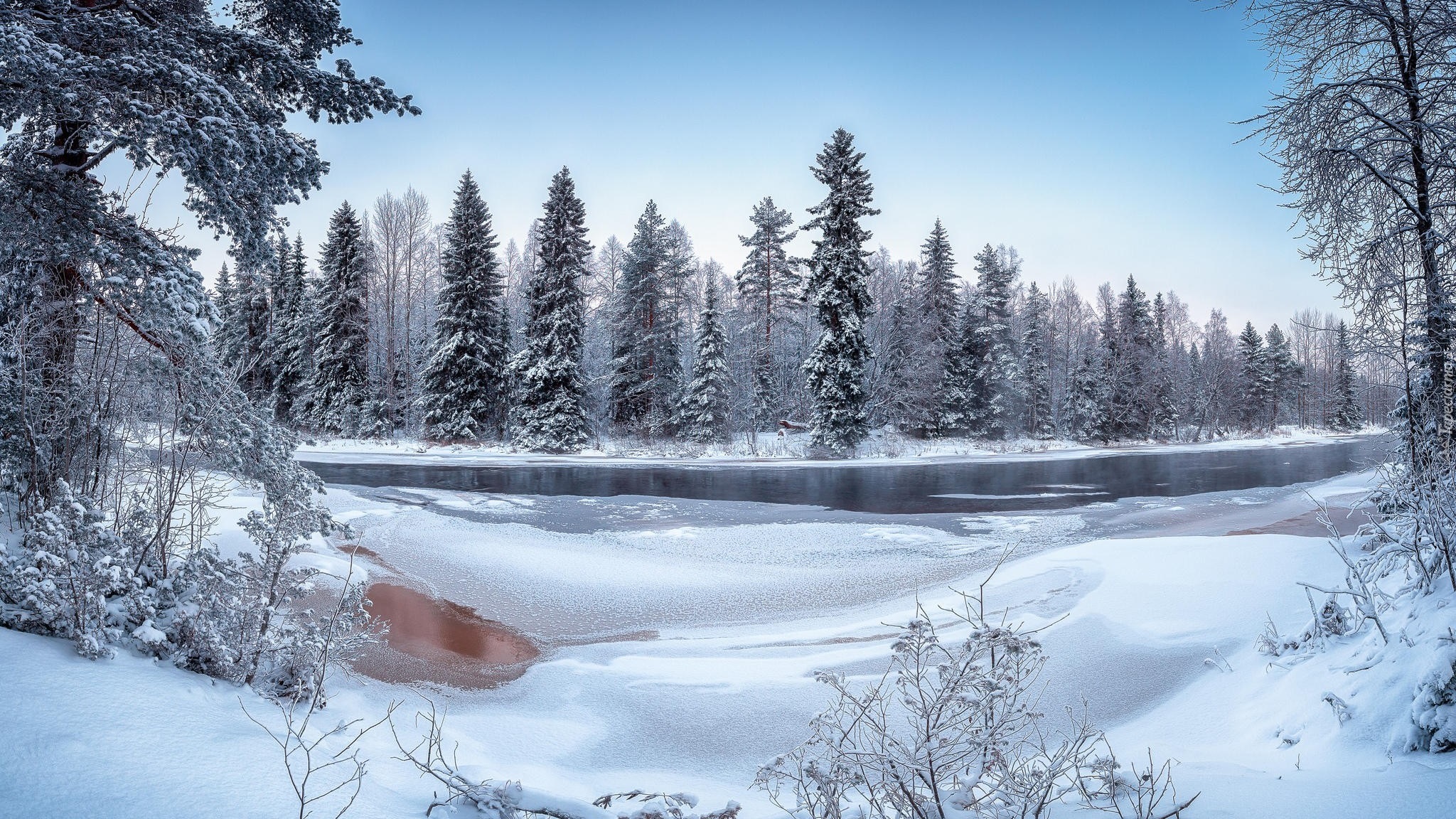 Edytor tapety: Zimowe drzewa nad oblodzoną rzeką