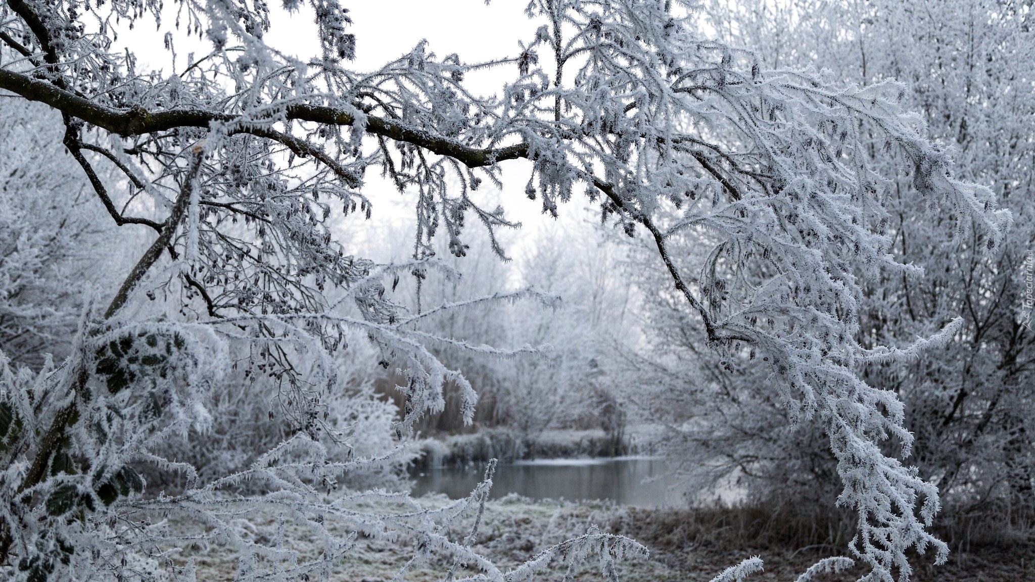 Edytor tapety: Oszronione gałęzie drzew nad stawem w lesie