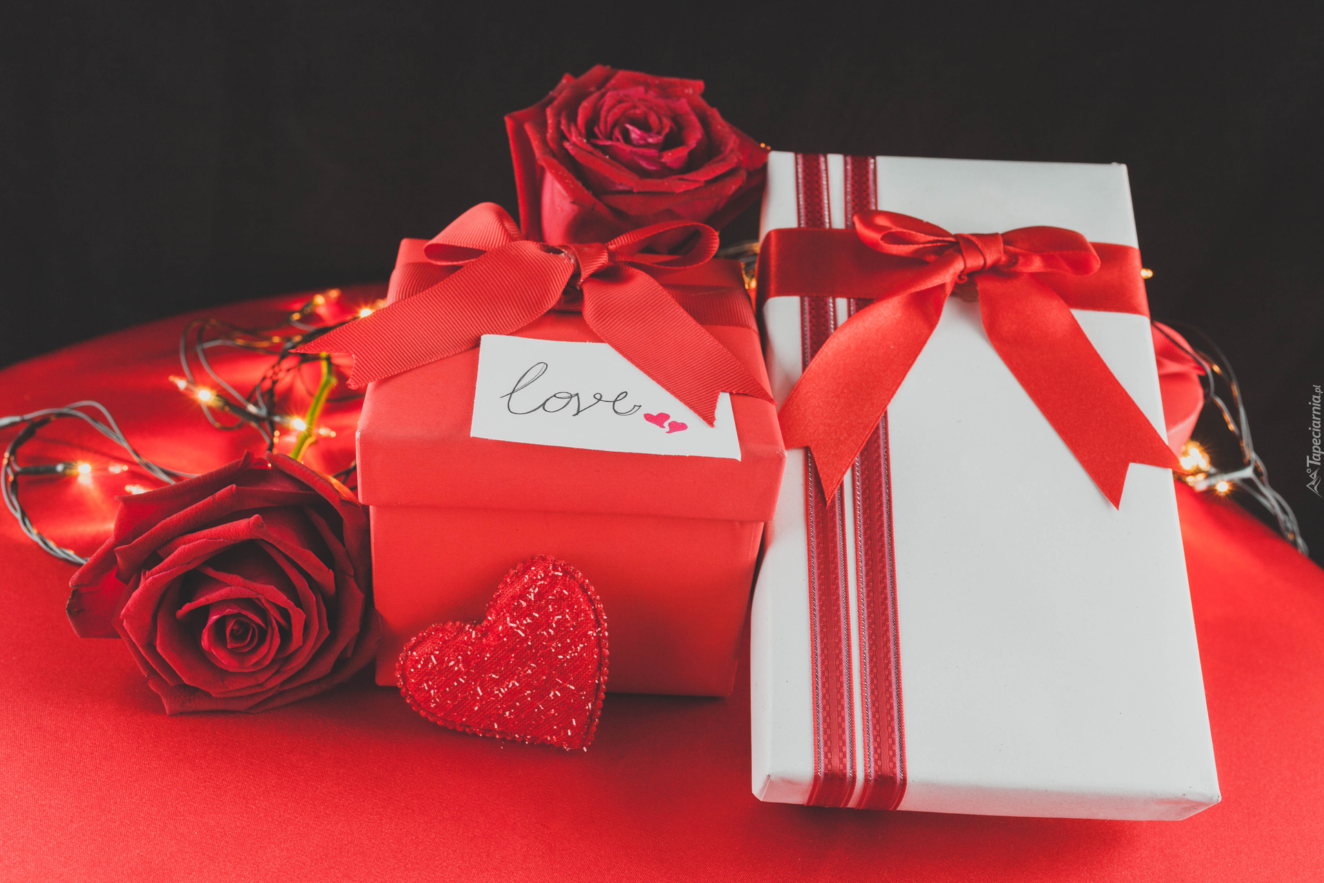 Edytor tapety: Prezenty walentynkowe z czerwonymi różami i sercem