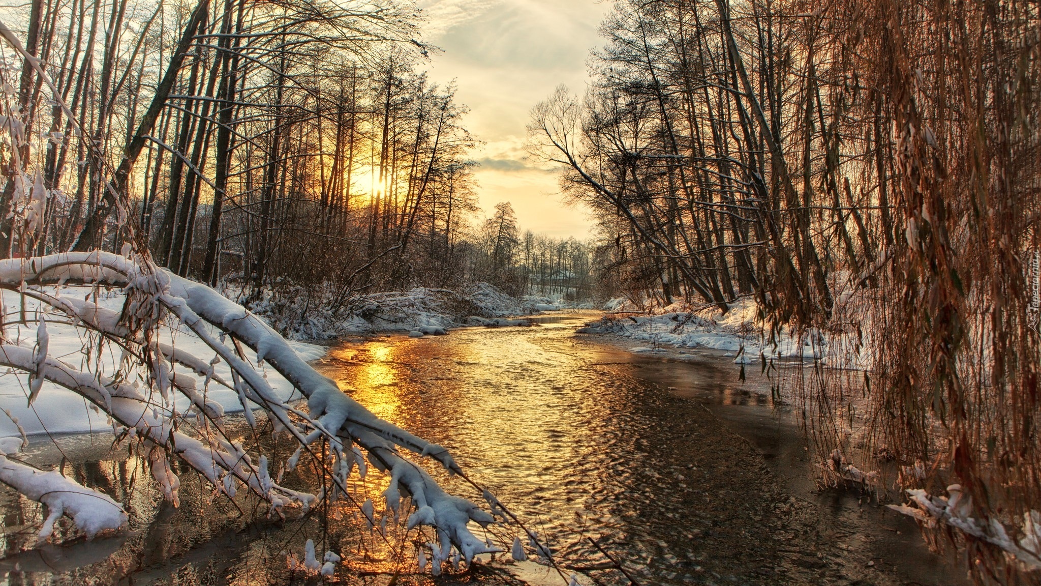 Edytor tapety: Ośnieżone drzewa nad rzeką i przebijające słońce