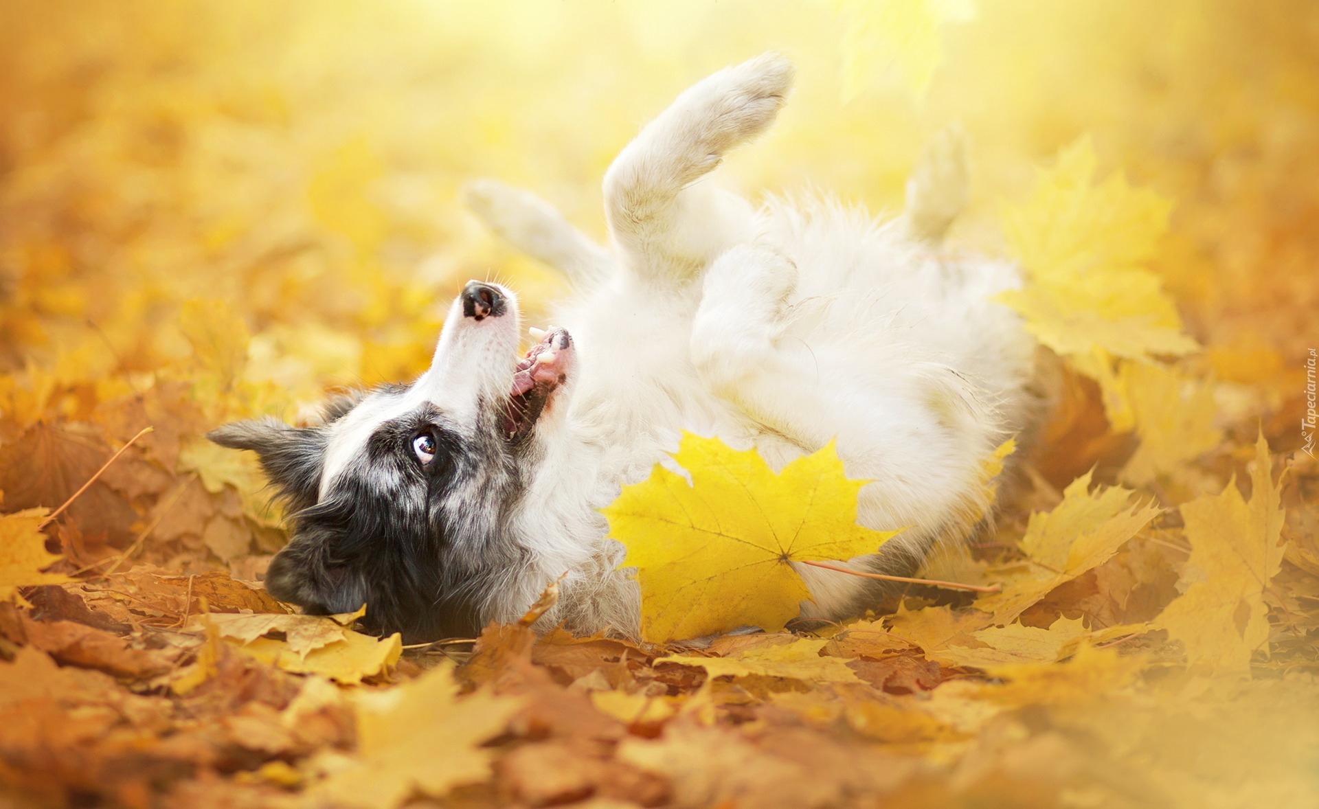 Edytor tapety: Border collie tarza się w jesiennych liściach
