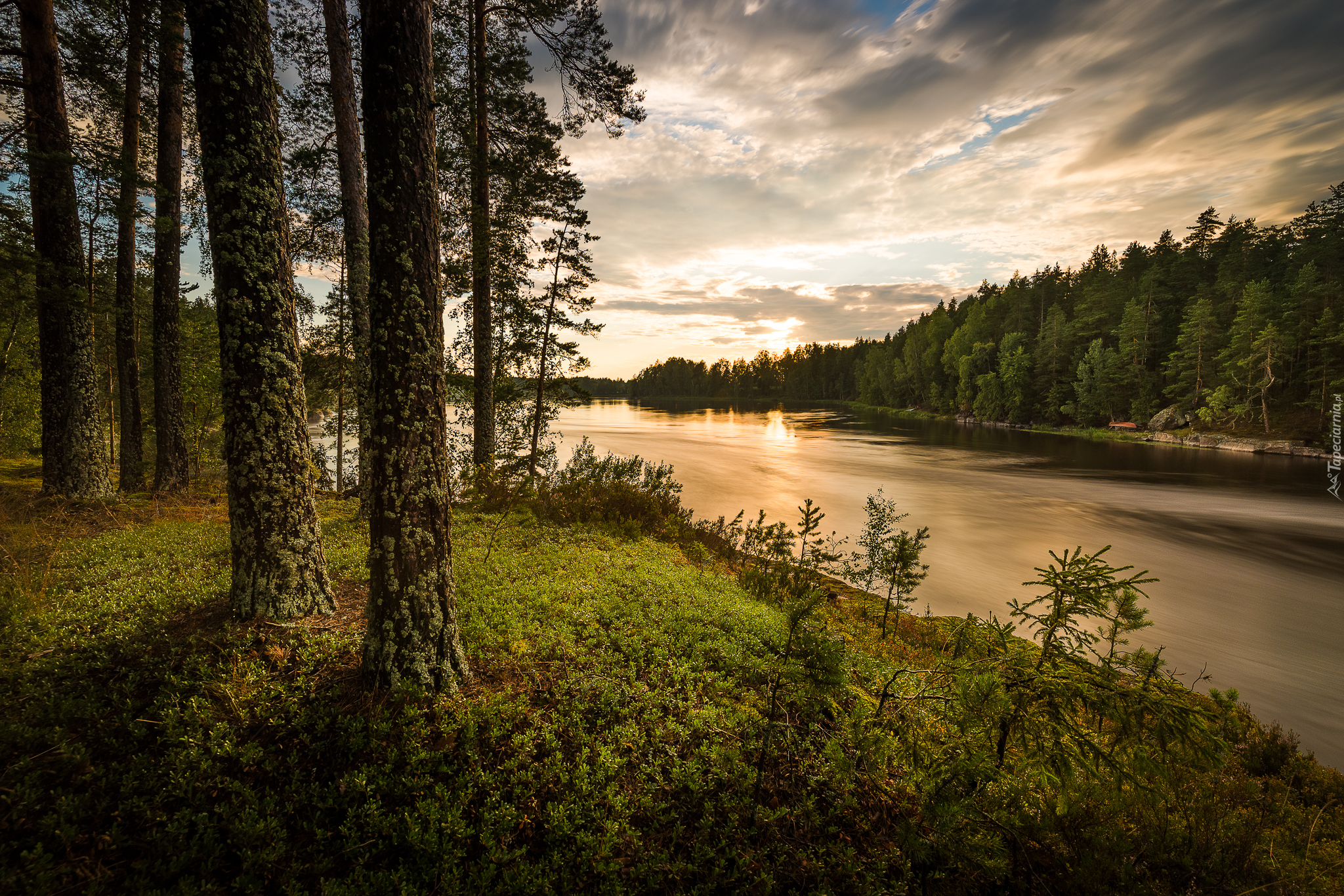 Edytor tapety: Ciemne chmury nad rzeką w lesie