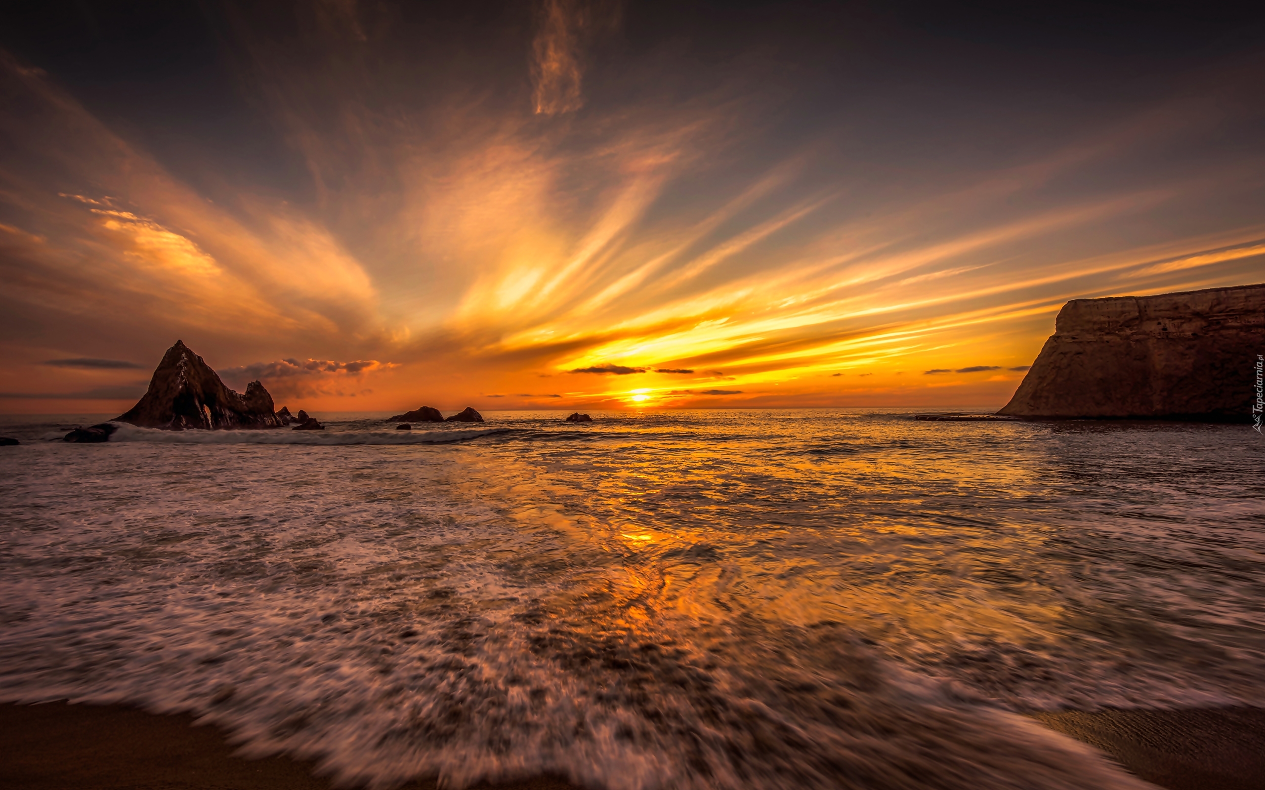 Edytor tapety: Skały na morzu w blasku zachodzącego słońca