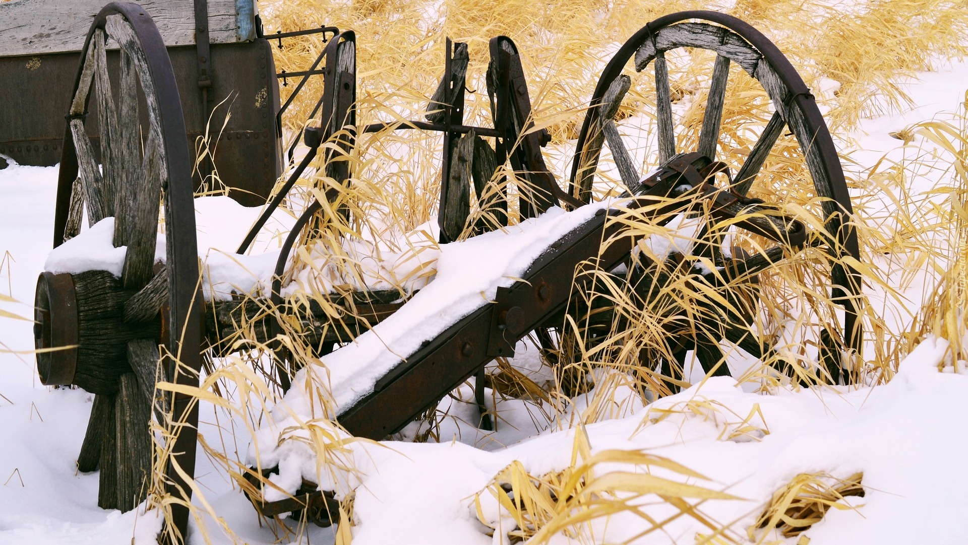 Edytor tapety: Zniszczona maszyna rolnicza w trawie przysypana śniegiem