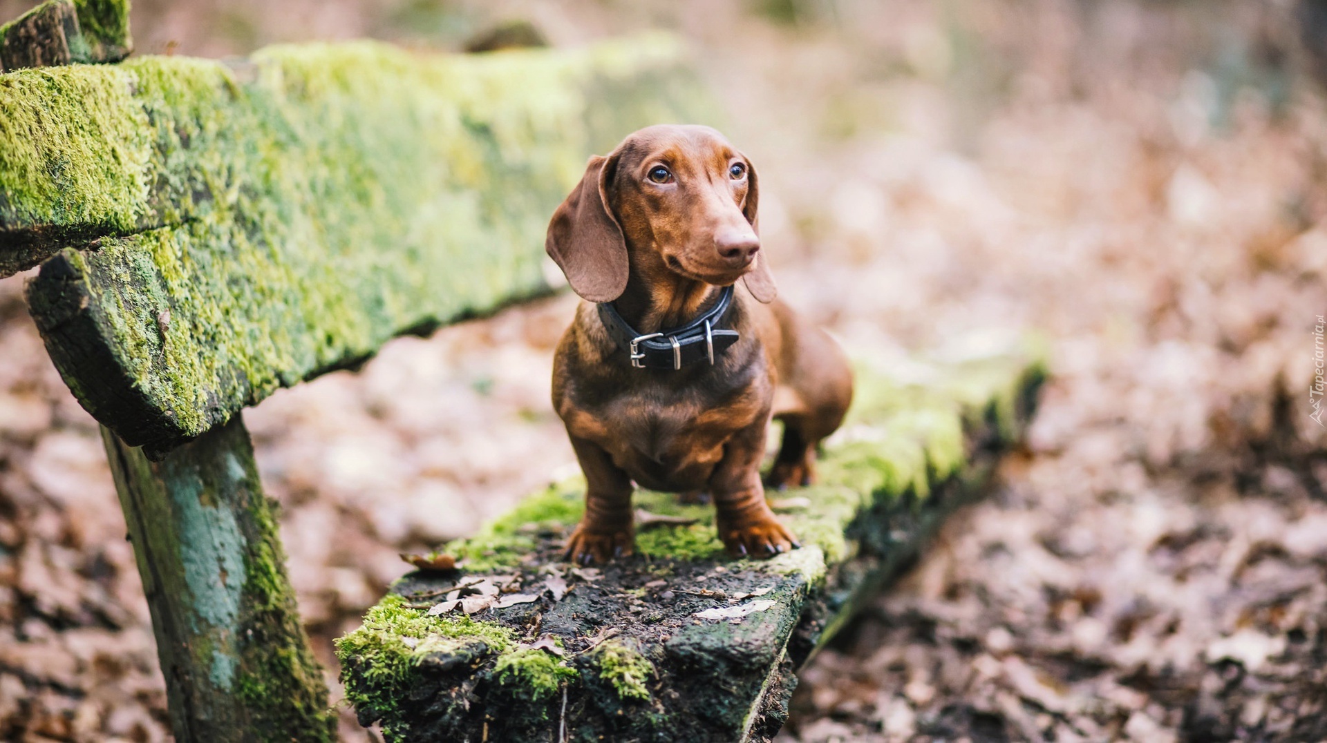 Edytor tapety: Jamnik przysiadł na omszałej ławce