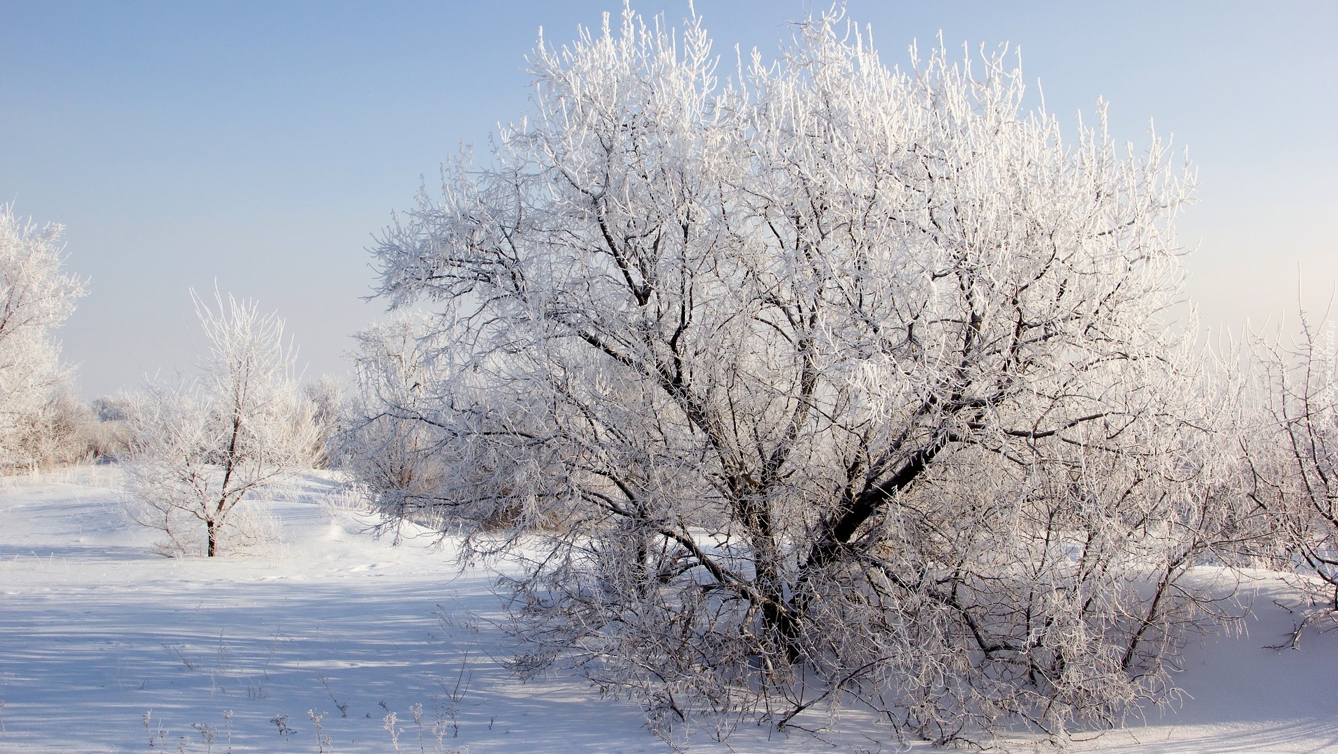 Edytor tapety: Pole i drzewa pokryte śniegiem