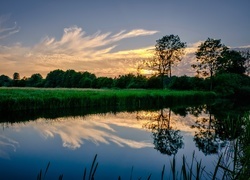 Edytor tapety: Słońce zachodzące za drzewa odbija się w jeziorze