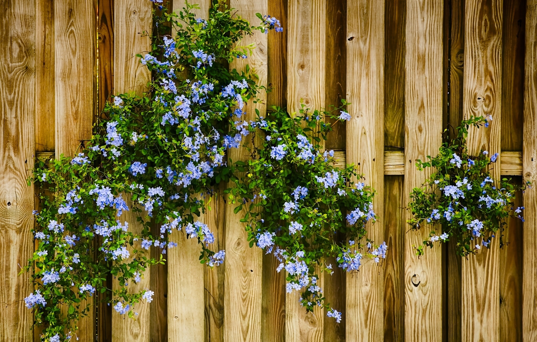 Edytor tapety: Niebieskie kwiatuszki na drewnianym ogrodzeniu