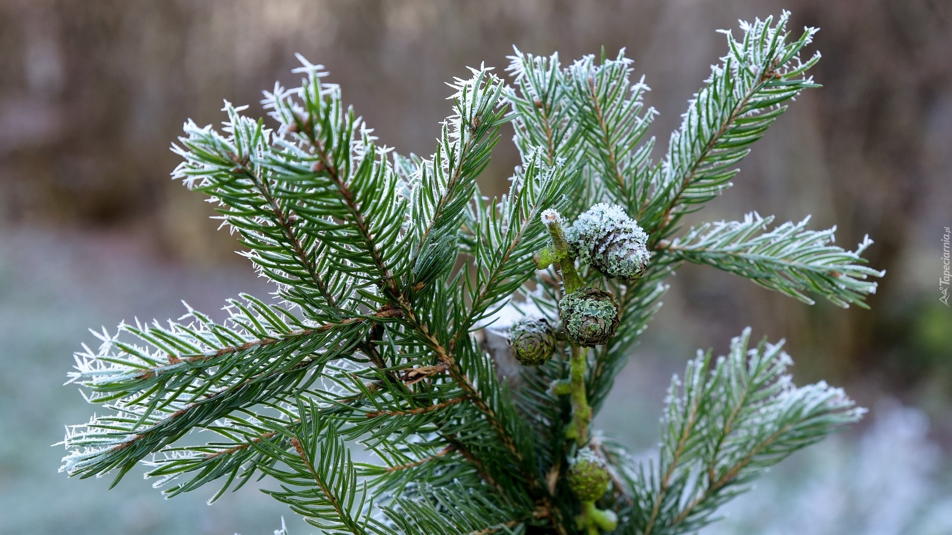 Edytor tapety: Oszronione gałązki świerku czarnego z szyszkami