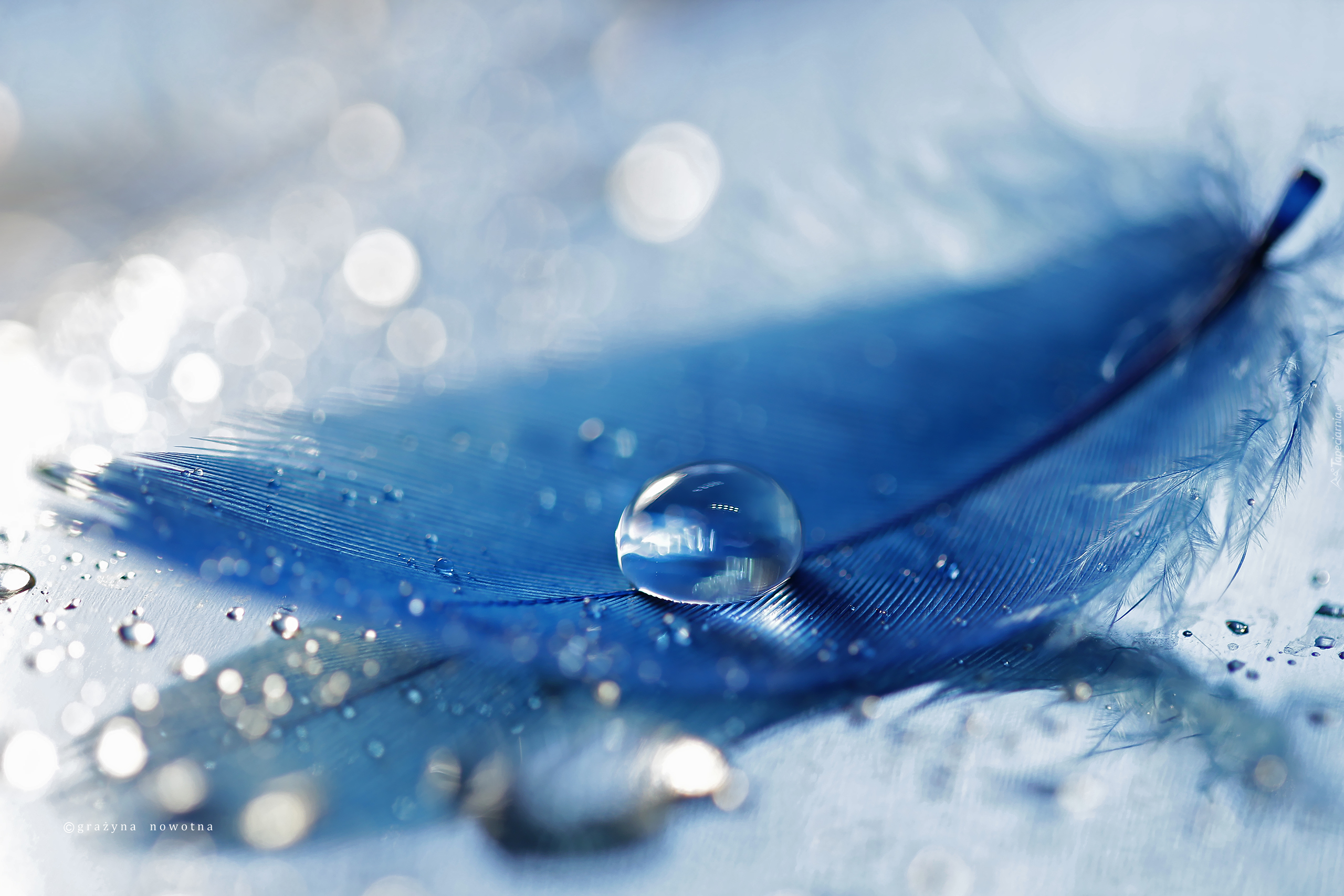 Edytor tapety: Kropla wody na niebieskim piórku