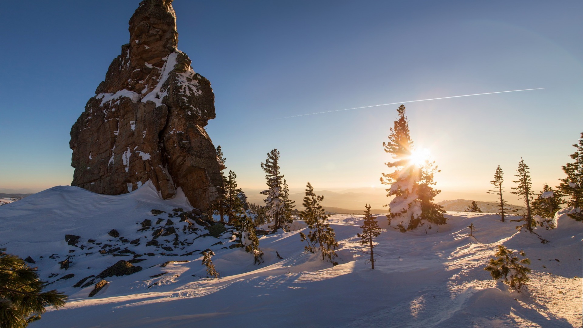 Edytor tapety: Skała i drzewa w blasku zimowego słońca