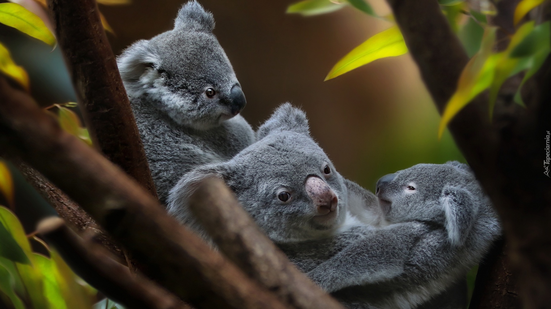 Edytor tapety: Niedźwiadki koala usadowiły się na gałęziach