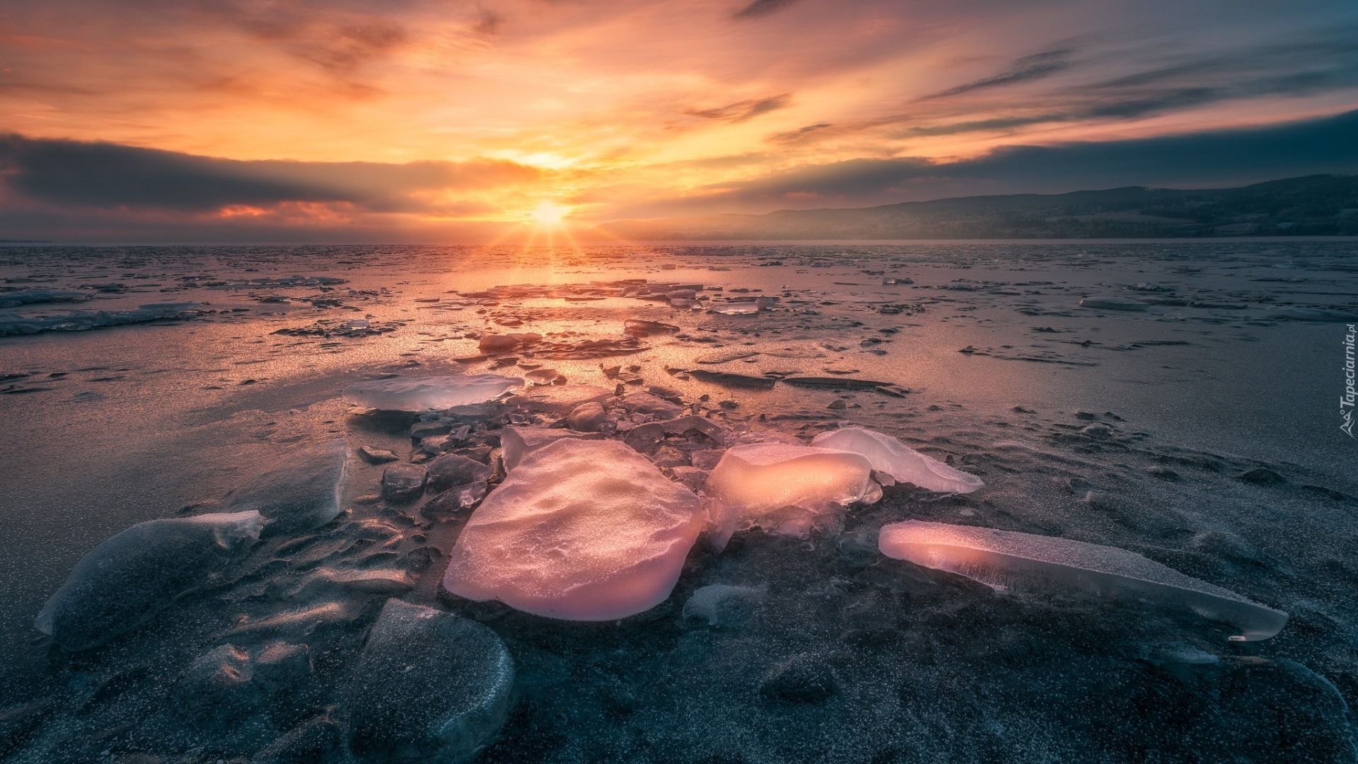 Edytor tapety: Oblodzone jezioro w promieniach zachodzącego słońca