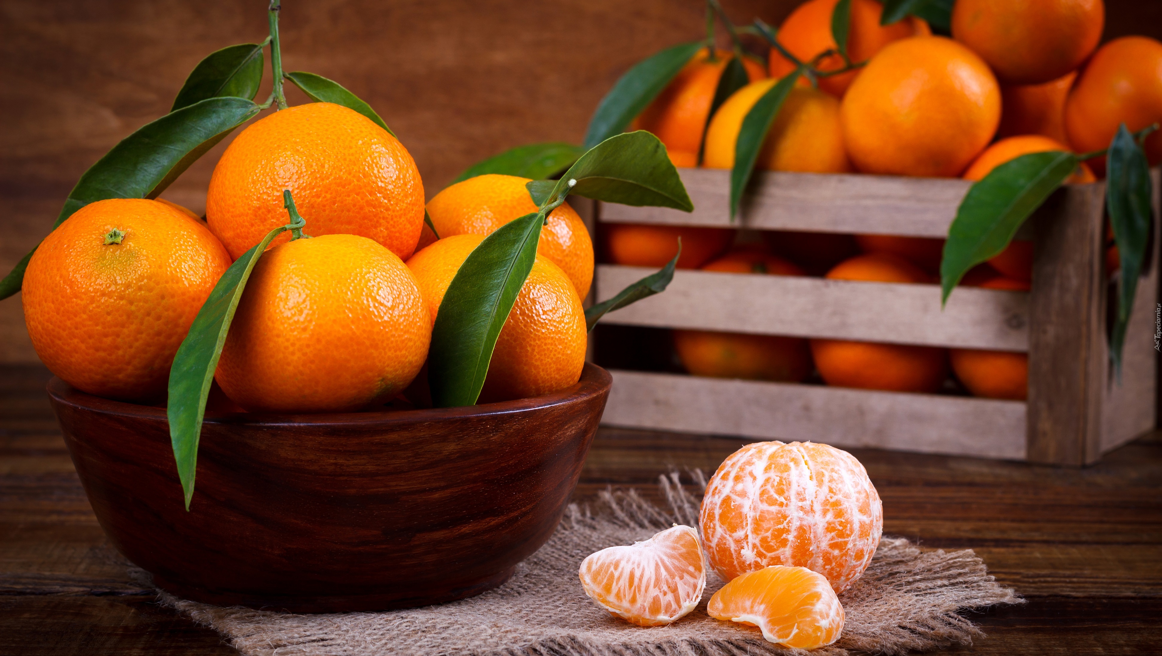 Edytor tapety: Dorodne mandarynki w misie i skrzynce