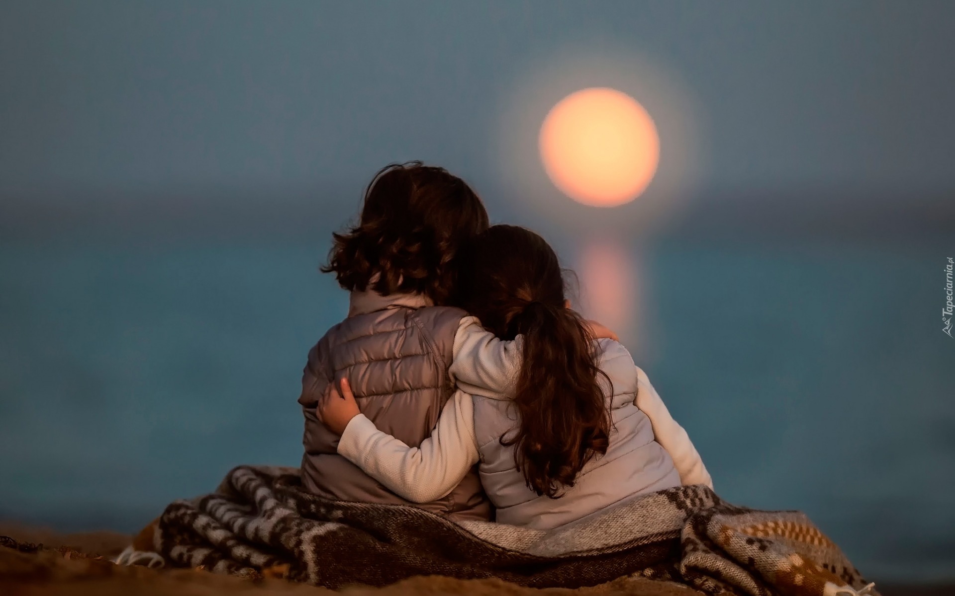 Edytor tapety: Przytulone dzieci obserwują zachód słońca