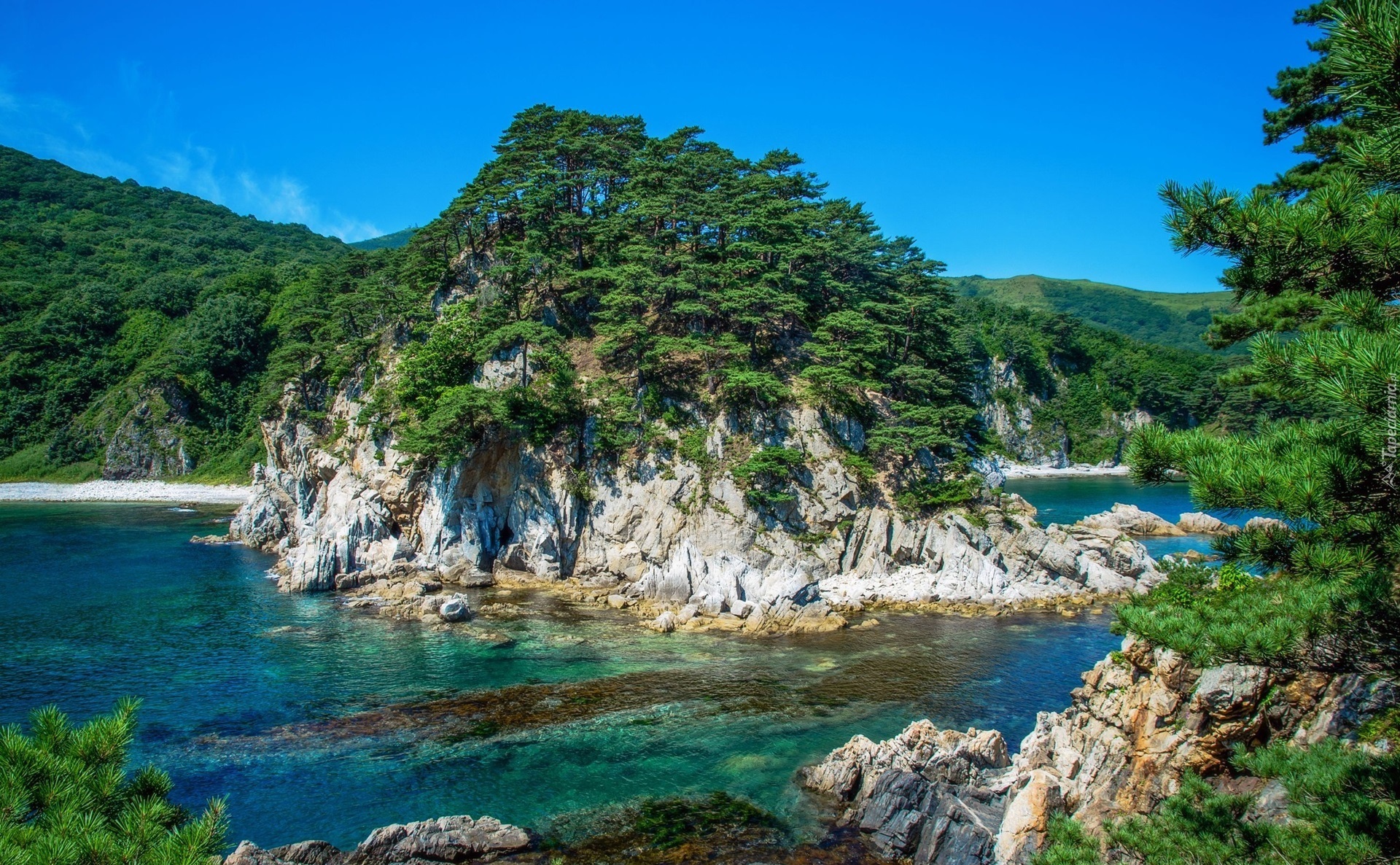 Edytor tapety: Drzewa na skale pośrodku jeziora